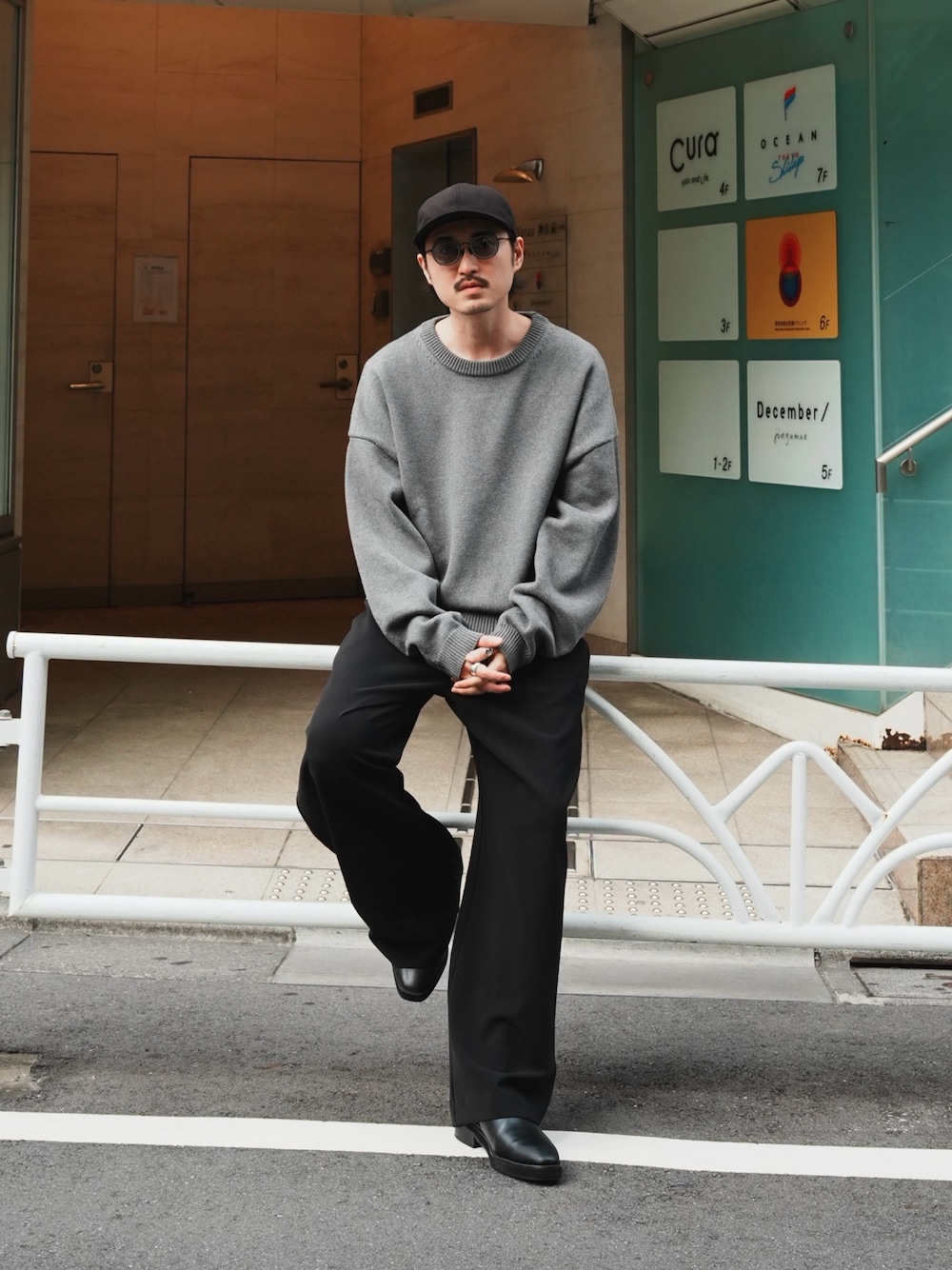 グレーのニットに黒のスラックスを合わせた、シンプルなモノトーンコーデ。比較的ハイゲージのきれいめなニットが、カジュアルながらも上品な印象をプラスしています。上下ともにリラックス感のあるシルエットでまとめることで、大人の余裕を感じさせる着こなしに。