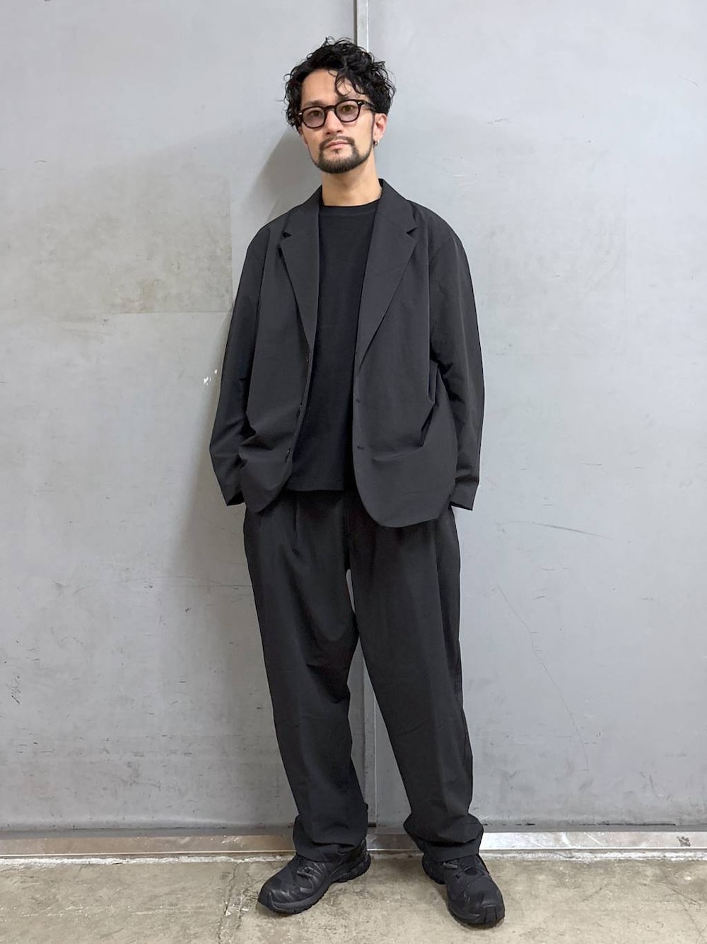 リラックス感のある黒のジャケットに、同素材のパンツを合わせたセットアップコーデ。少し肩の落ちたゆとりのあるジャケットが、かっちりしすぎない、こなれた雰囲気を演出しています。足元をスニーカーで外すことで、きれいめながらも抜け感のあるスタイルに。