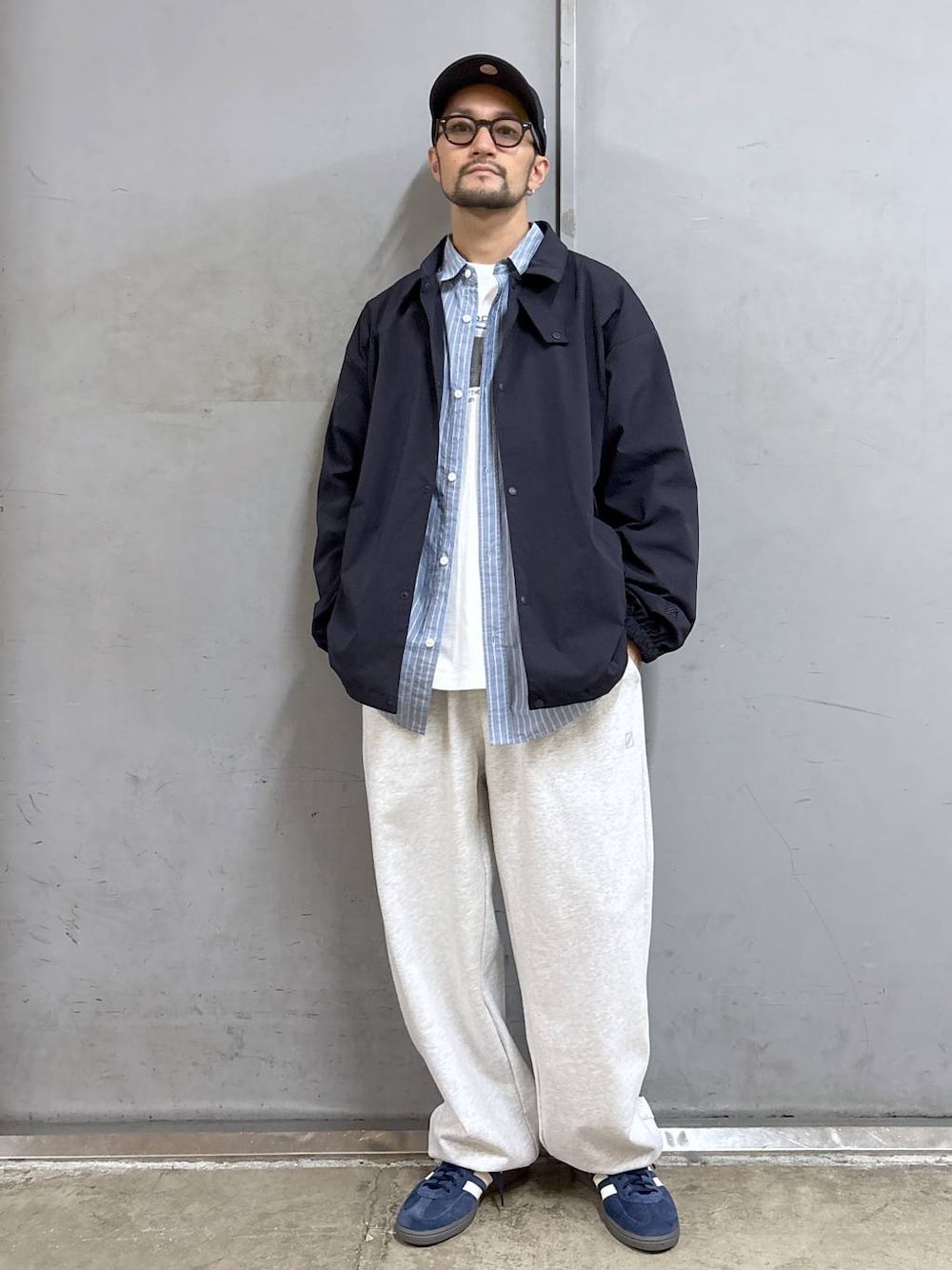 Tシャツとシャツの上にコーチジャケットを重ねた、秋のレイヤードコーデです。ジャケットとTシャツの間にストライプシャツを挟むことで、着こなしに奥行きと爽やかさが生まれています。上半身はきれいめにまとめつつ、ボトムスはスウェットパンツで外したバランス感覚が絶妙なスタイルです。