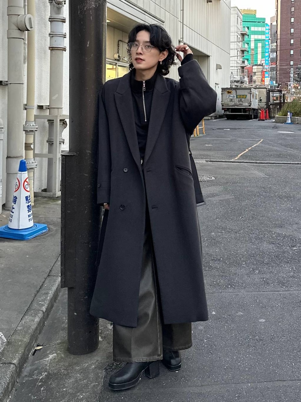 グレーのロングコートを主役にした冬コーデ。重厚感のあるロングコートが、冬らしい季節感とシックな雰囲気を演出しています。全身を落ち着いた色で統一しつつ、レザー調のパンツなど異素材をミックスすることで、単調に見えない立体感のある着こなしに。