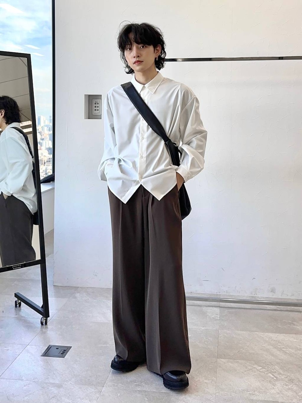 白シャツにブラウンのワイドパンツを合わせた、春らしいきれいめコーデ。風になびくような、とろみ感のある素材のシャツとパンツが春の軽やかなムードを演出。全体をミニマルな色使いでまとめることで、上品で洗練された印象に仕上げています。