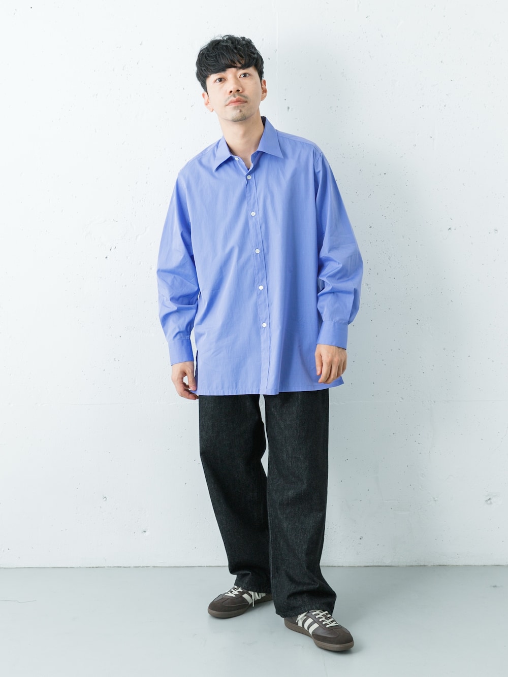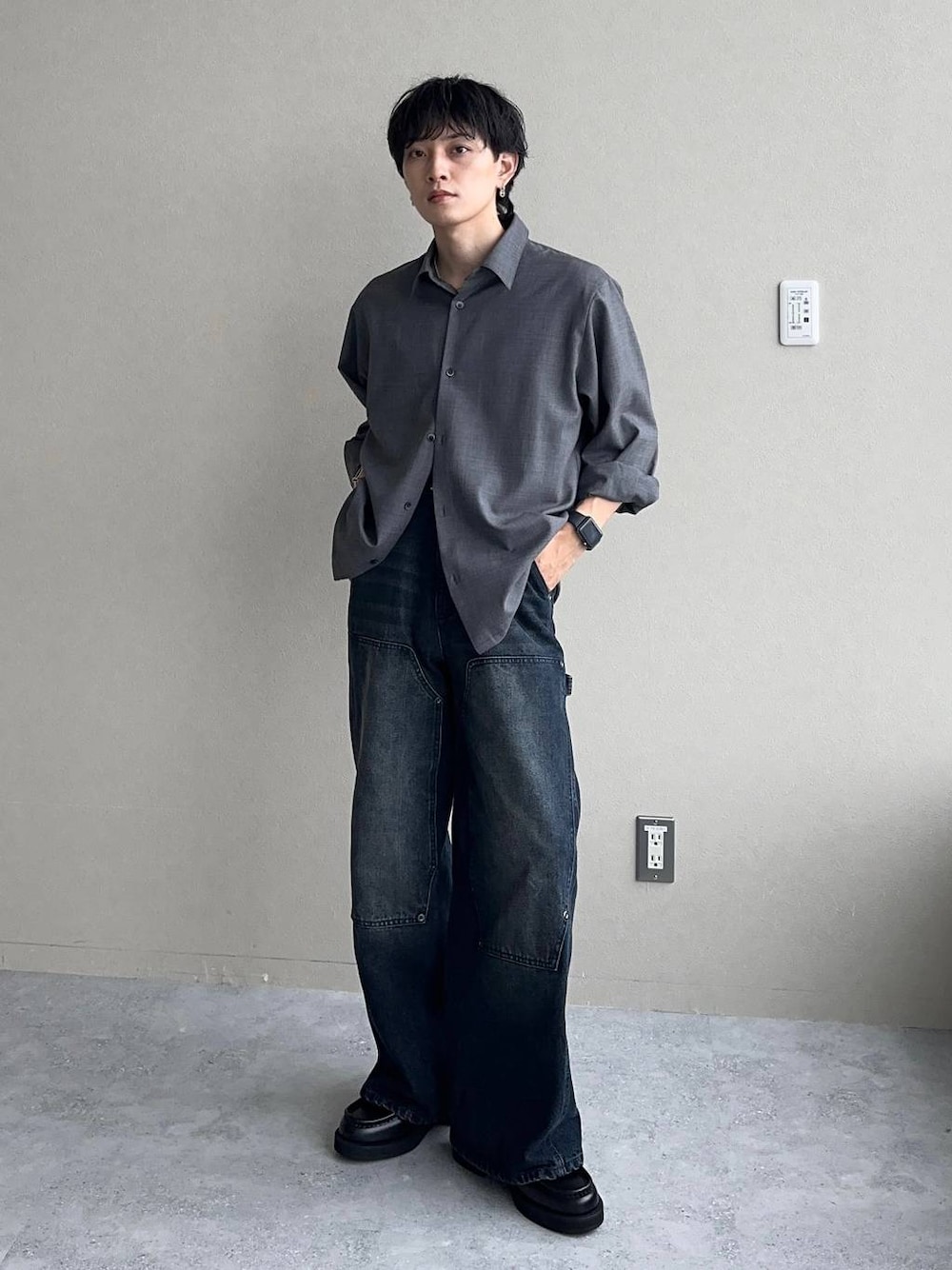 きれいめなシャツに、ヴィンテージ感のあるワイドデニムを合わせたコーディネート。カジュアルなデニムにあえて上品なシャツと革靴を合わせることで、バランスの取れた着こなしに。全体をダークトーンで統一することで、大人っぽく洗練された雰囲気を演出しています。