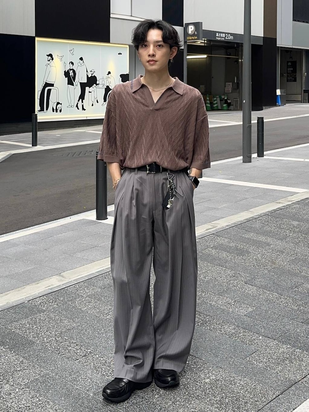 ブラウンのニットポロシャツに、グレーのワイドスラックスを合わせたコーデ。ストンとした落ち感のあるスラックスが、着こなしにモードな雰囲気をプラスしています。トップスをタックインすることで、パンツのきれいなシルエットを際立たせた着こなしに。