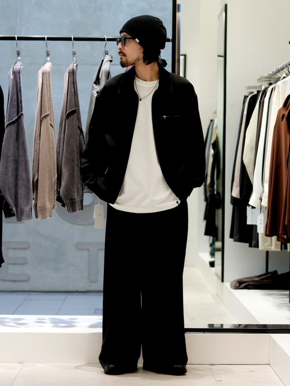 黒のブルゾンとワイドパンツに、白Tシャツを合わせたモノトーンコーデ。インナーに上質な白Tシャツを合わせることで、着こなしに清潔感と抜け感をプラス。シンプルなアイテムの組み合わせながら、洗練された大人の雰囲気を演出しています