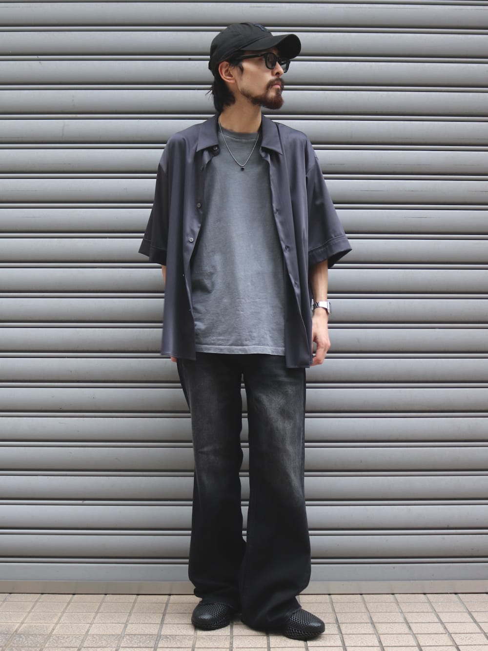 半袖シャツにワイドなデニムを合わせた、夏のダークトーンコーデ。軽やかな半袖シャツや、風通しの良いリラックスしたシルエットが、夏らしい涼しげな印象を演出。全体を落ち着いた色味で統一することで、カジュアルながらも大人っぽく洗練された雰囲気に仕上げています。