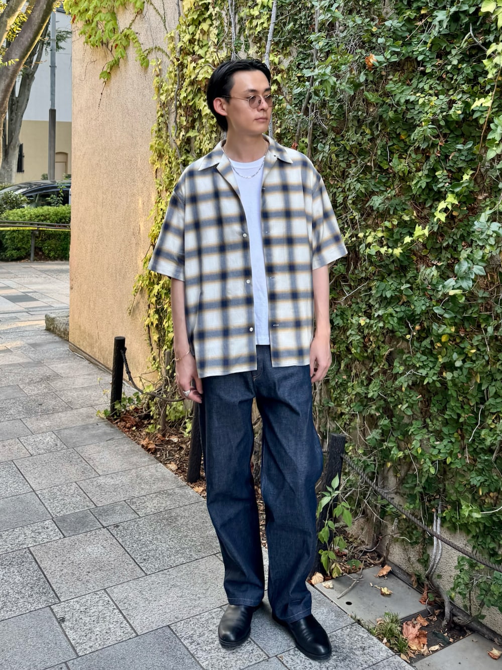 チェック柄の半袖シャツに、ワイドなデニムパンツを合わせたカジュアルコーデ。ラフな印象のコーディネートを、足元の革靴で引き締めるのがポイントです。カジュアルな中にきれいめな要素をプラスすることで、ぐっと大人びた印象に。