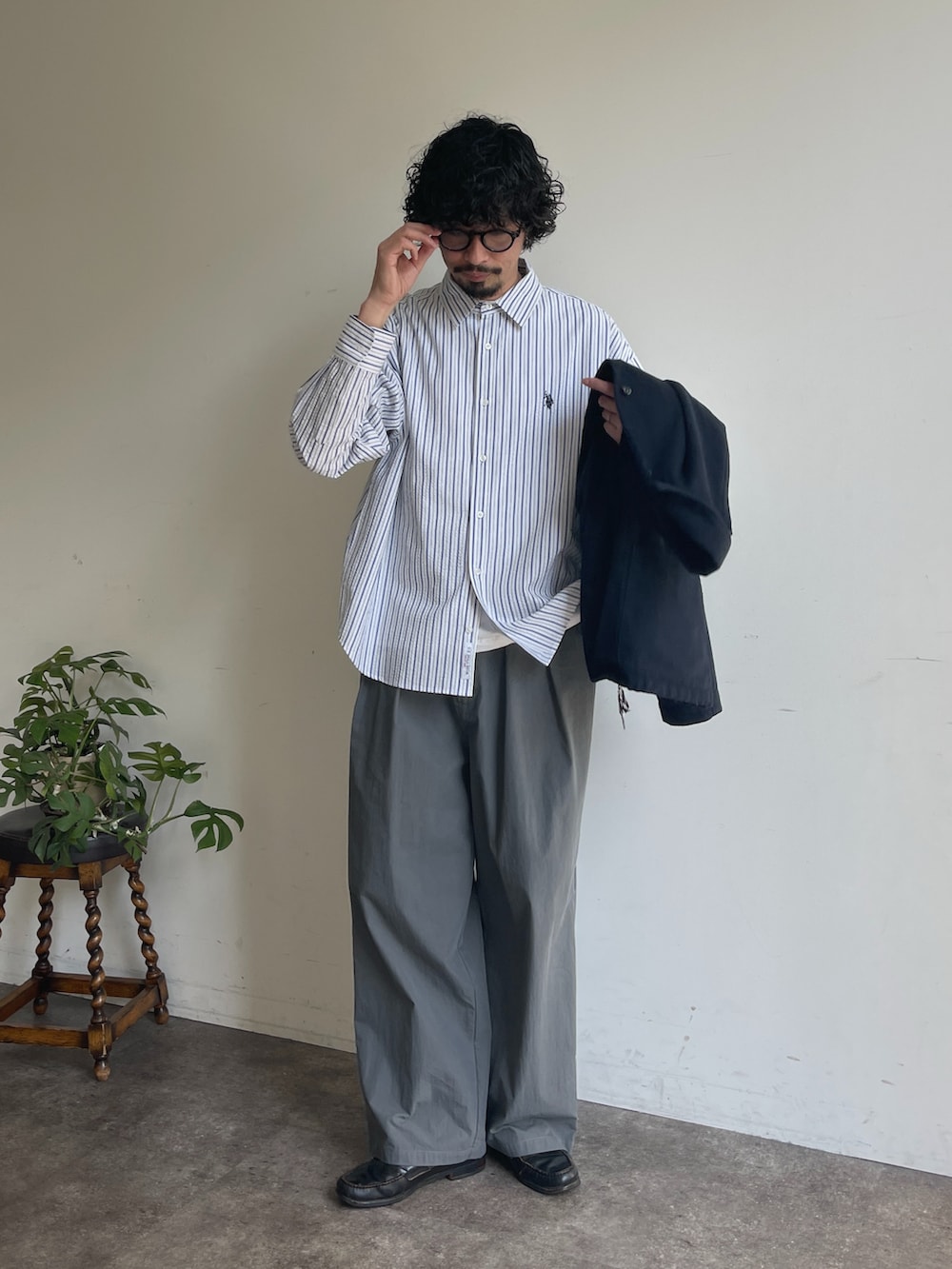 ブルーのストライプシャツに、グレーのワイドパンツを合わせたコーディネートです。定番のストライプシャツをビッグシルエットで着こなすことで、今っぽいリラックス感を演出。ボトムスにきれいめなワイドパンツを合わせることで、カジュアルになりすぎない絶妙なバランスに。
