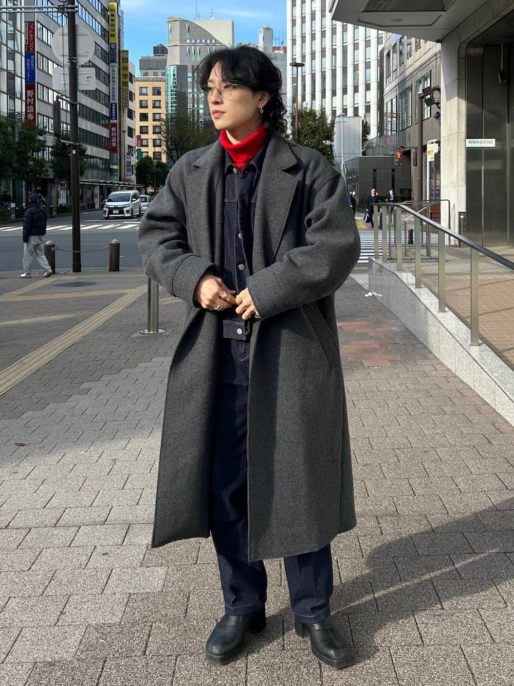 チャコールグレーのウールコートのインナーに、デニムのセットアップを合わせた上級者コーデ。カジュアルなデニムスタイルにきれいめなロングコートを羽織ることで、ぐっと大人びた印象に。首元から覗くレッドのタートルネックが、コーディネートの絶妙な差し色になっています。