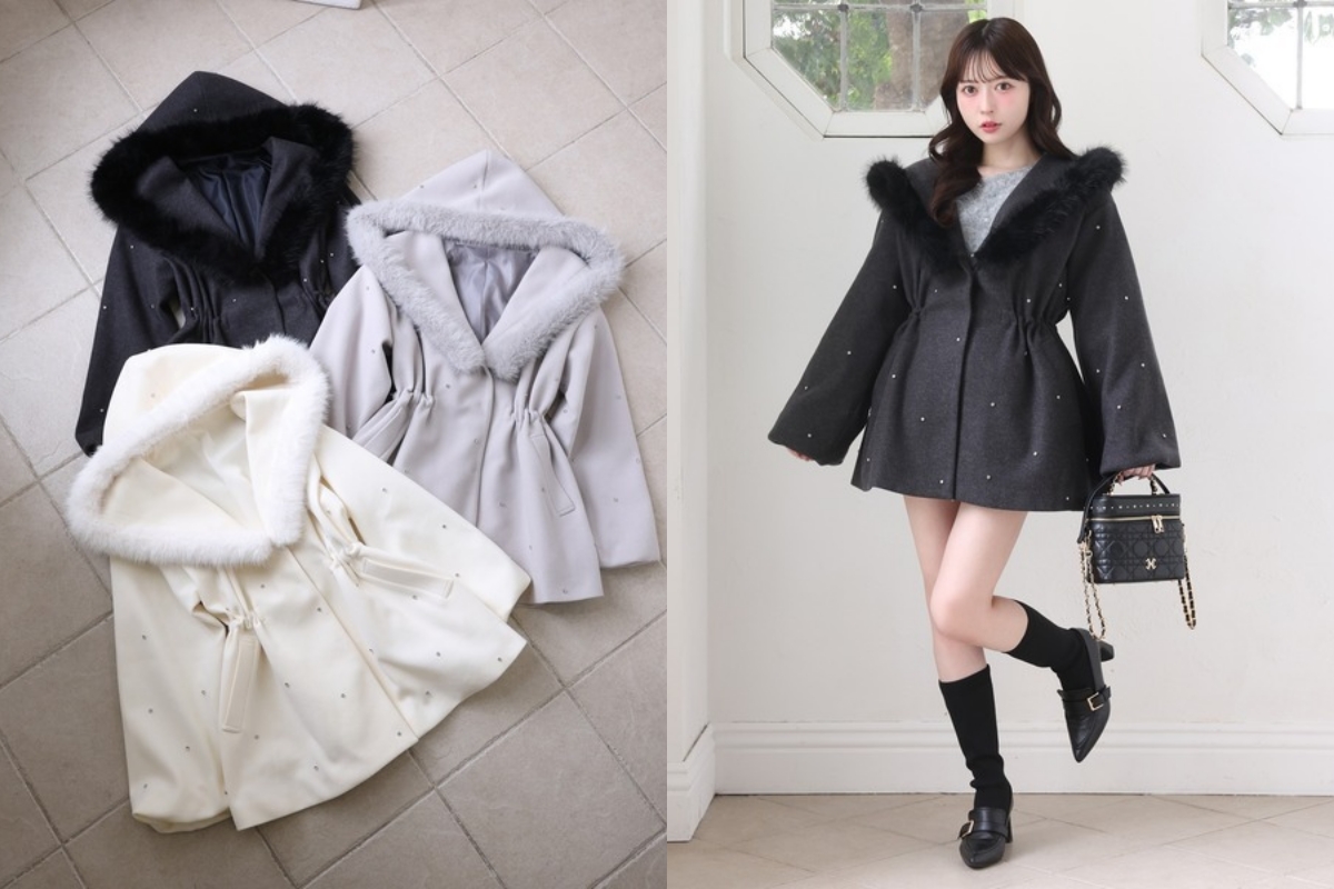 キラキラと輝くビジューが目を引くミドル丈コート。フードにはふんわりとしたファーがあしらわれており、顔まわりを華やかに演出します。ウエスト部分は絞れるデザインになっているため、気分やコーディネートに合わせてシルエットの調整が可能。寒い日でも暖かく過ごせるのが魅力です。ニットワンピースと合わせれば上品なフェミニンスタイルに、デニムと合わせれば大人可愛いカジュアルスタイルが完成します。
