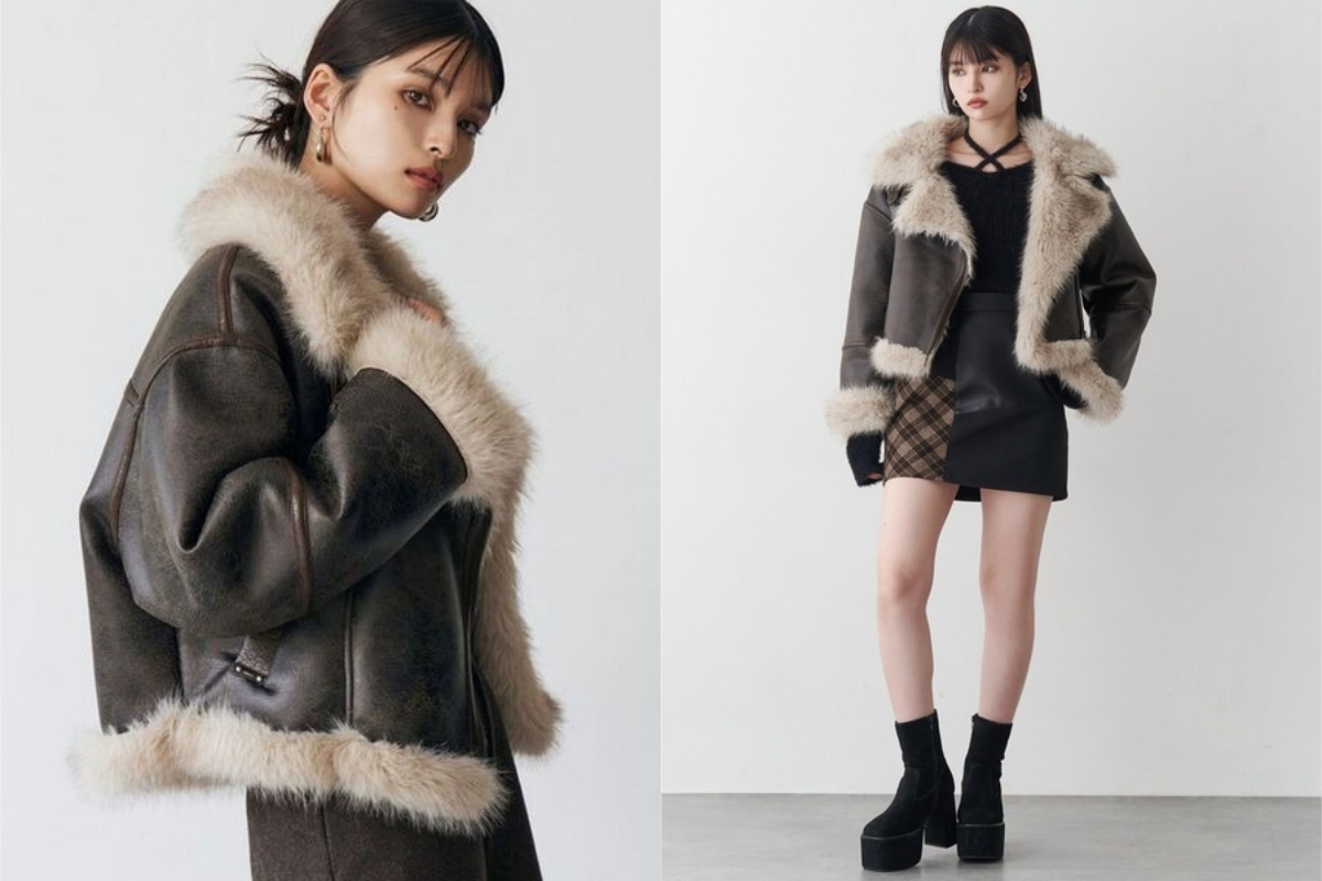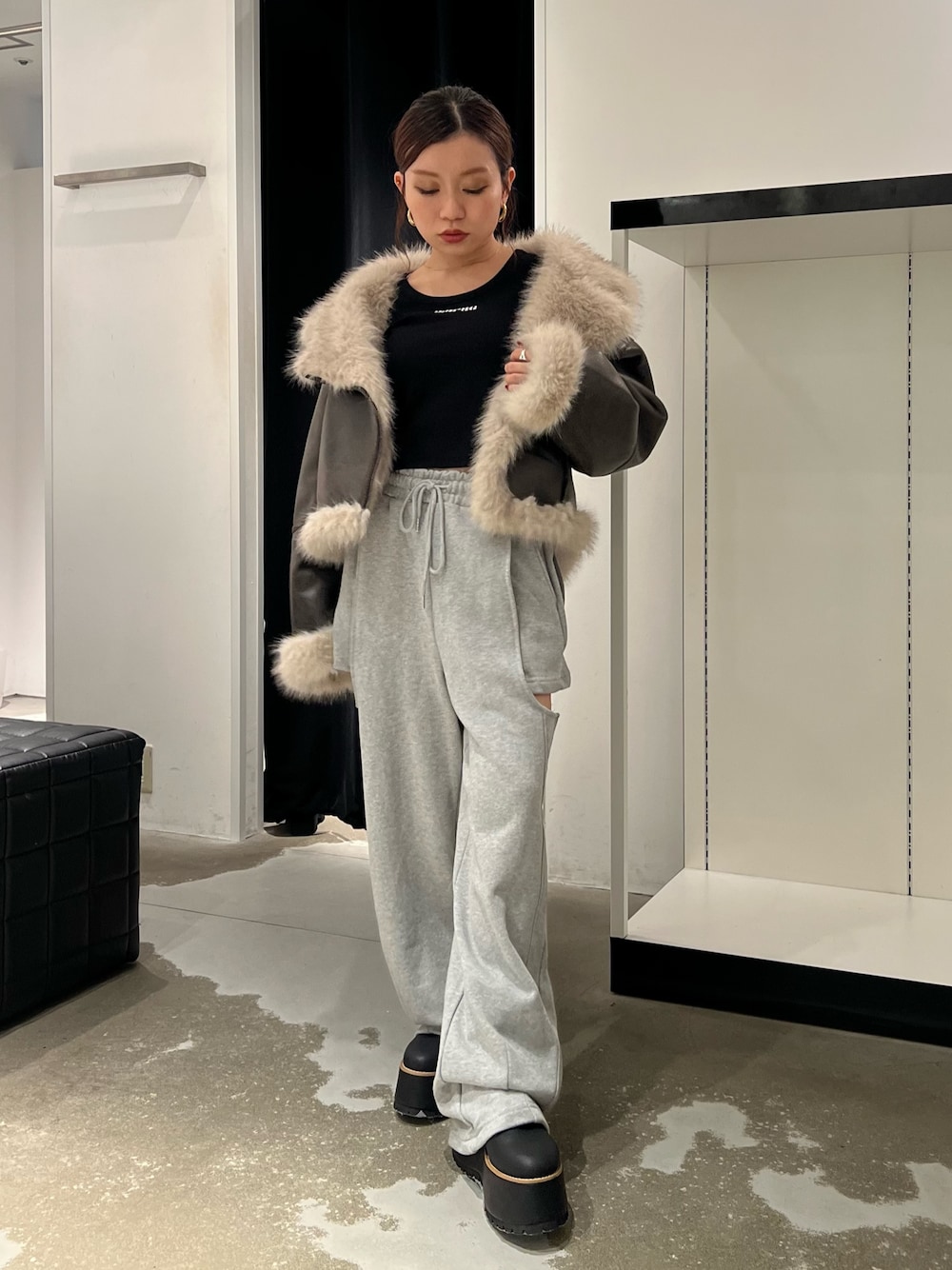 ボリュームファーが目を惹くショートフェイクムートンジャケットに、スウェットパンツを合わせたコーデ。 ラグジュアリーなアウターにあえてカジュアルなボトムスを合わせることで、こなれ感のある着こなしが完成します。 ショート丈のジャケットが上半身をコンパクトに見せ、スタイルアップ効果を高めている点もポイント。