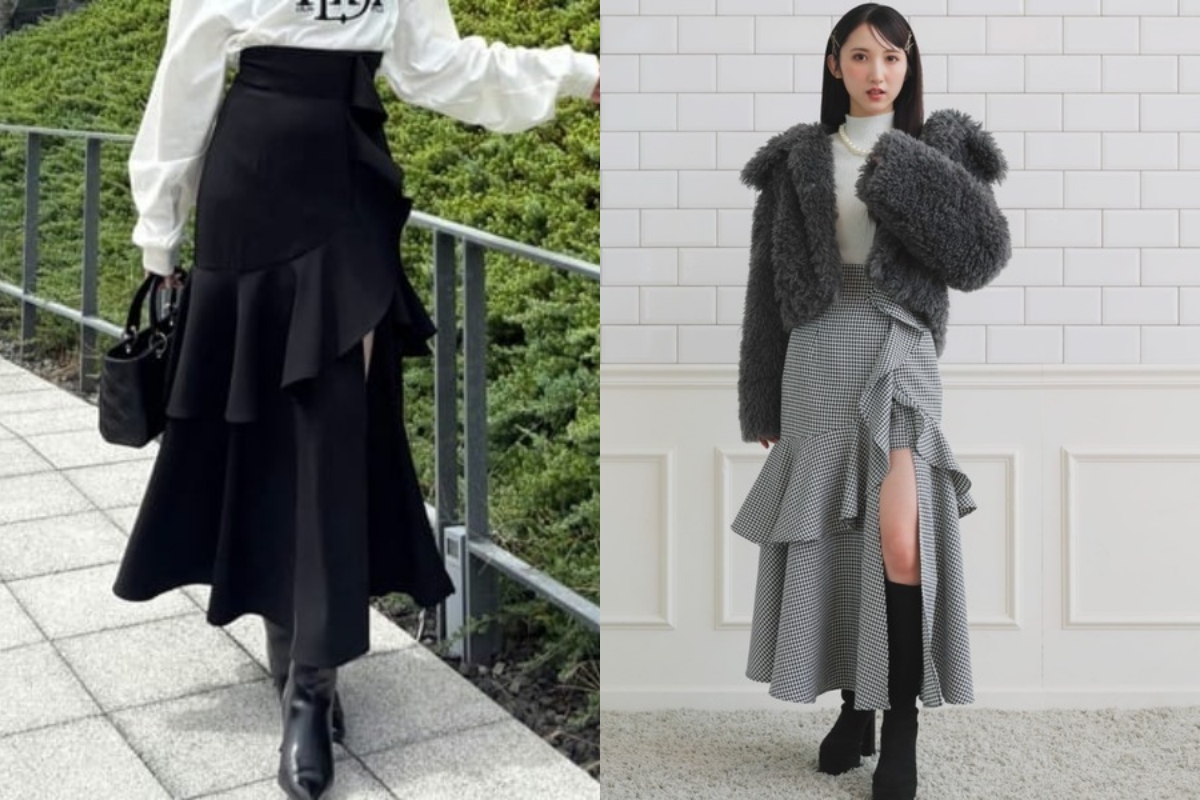 ウエストから裾へ広がるマーメイドラインと大胆なスリットが、大人っぽさのあるフェミニンな印象です。 トップスをコンパクトにまとめることで、ボトムスの美しいデザインがより一層引き立つ着こなしに。