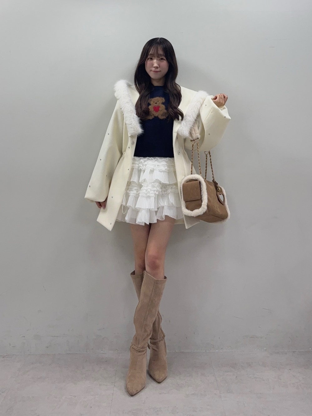 フードのファーやきらめくビジューが、顔まわりを華やかに彩ります。 甘くなりがちなアイテムの組み合わせも、ロングブーツを合わせれば大人っぽさがプラスされた好バランスなスタイルに。