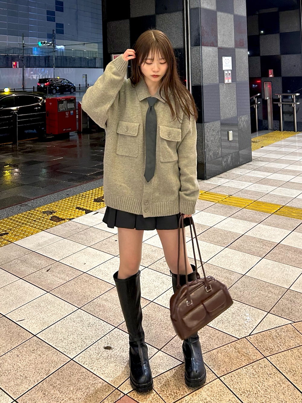 ニットカーディガンとミニスカートのプレッピーな着こなしに、トラックソールのロングブーツを合わせたコーデ。ネクタイを合わせて、トレンド感のあるスタイルに。 ミニスカートとロングブーツの組み合わせが、脚をよりすっきりと長く見せています。