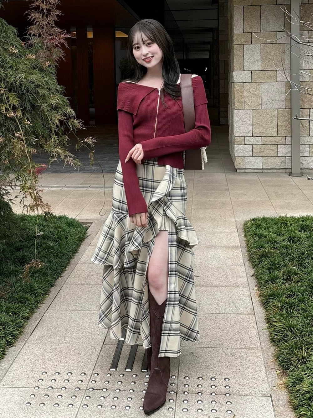 ボルドーのオフショルニットに、フリルデザインが華やかなチェック柄スカショーパンを合わせたコーデ。
