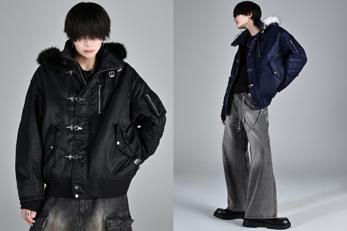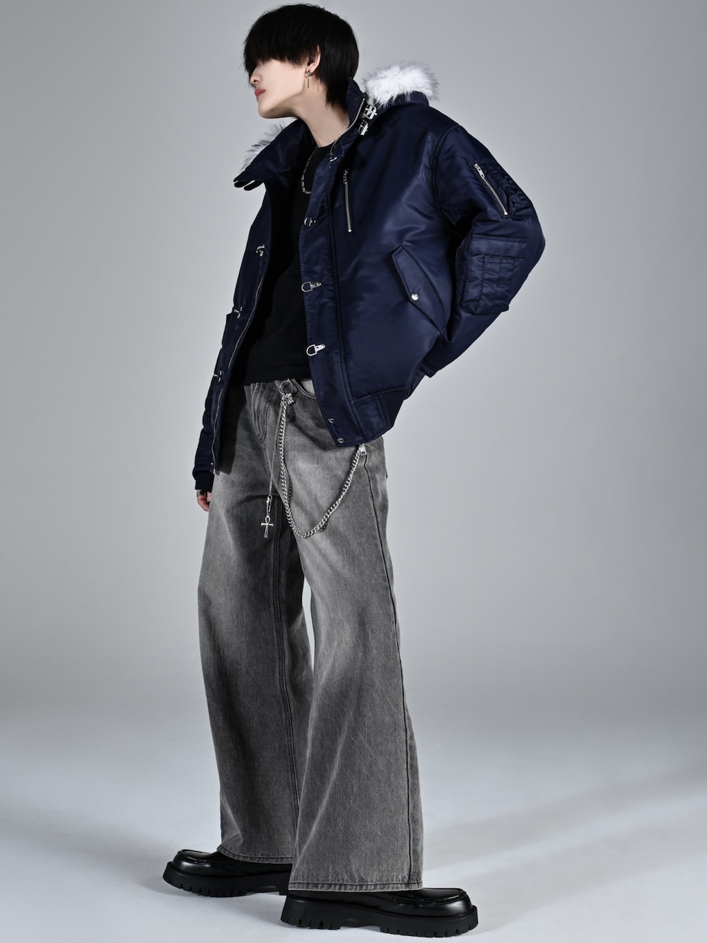 ネイビーのファー付きミリタリージャケットに、グレーのワイドデニムパンツを合わせたストリートコーデ。 ボリュームのあるアウターが着こなしの主役として、存在感を放っています。 全体をダークトーンでまとめつつ、ウォレットチェーンや厚底シューズでエッジを効かせた点がポイント。