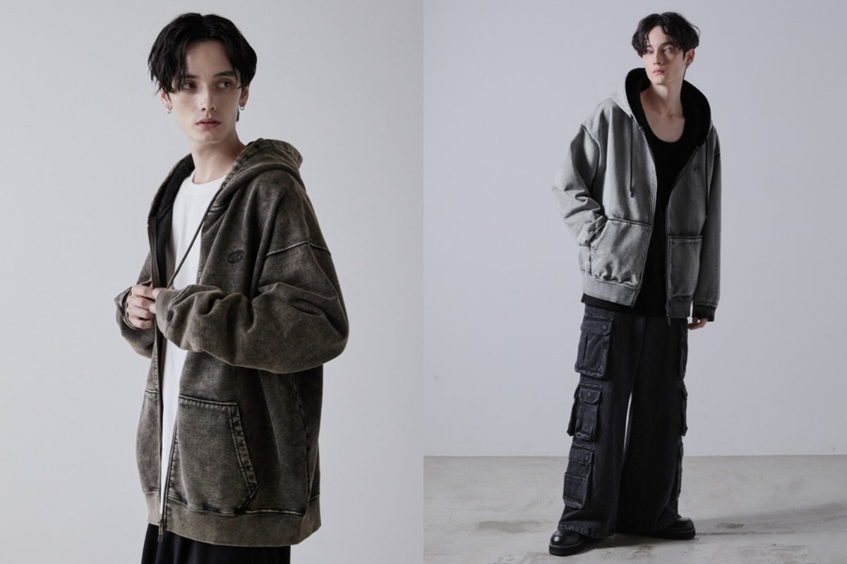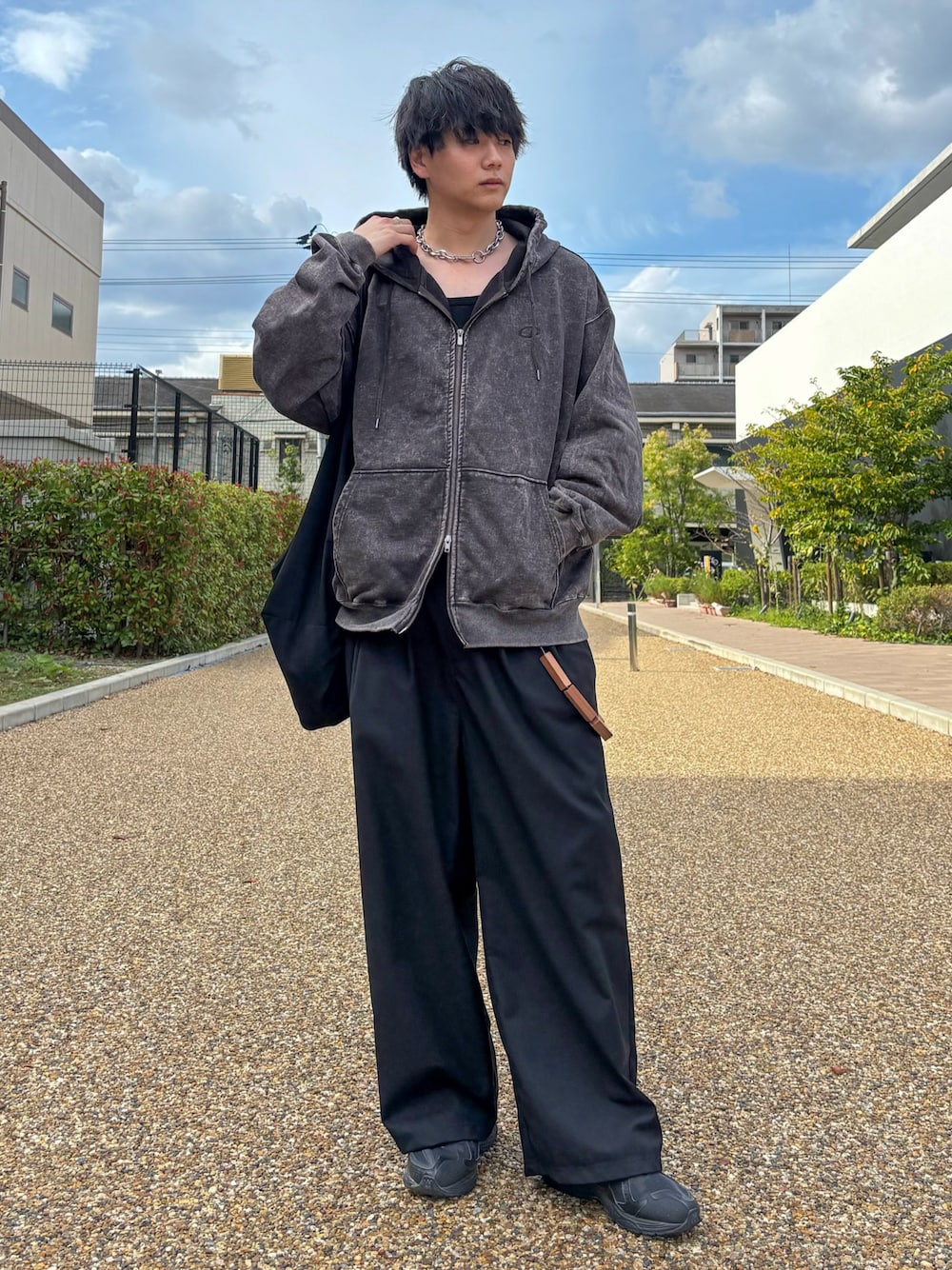グレーのジップアップパーカーに、ロゴTシャツとワイドスラックスを合わせたコーデ。 主役のパーカーは、前を開けてインナーのロゴをバランス良く見せることで、重ね着のアクセントとして活躍しています。 全体的にゆったりとしたシルエットでまとめながらも、ダークカラーでまとめてクールな印象に。