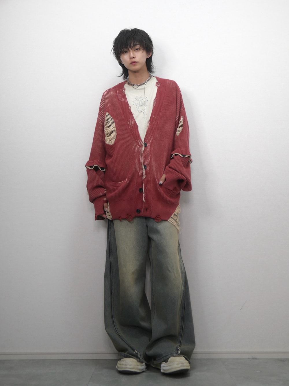 ダメージ加工が印象的なレッドのカーディガンに、色落ちしたワイドデニムを合わせたグランジコーデ。 デニムのヴィンテージライクな風合いとルーズなシルエットが、コーディネートに程よい抜け感をプラスしています。 トップスの強い個性に負けない存在感のあるデニムを選ぶことで、バランスの取れた着こなしに。