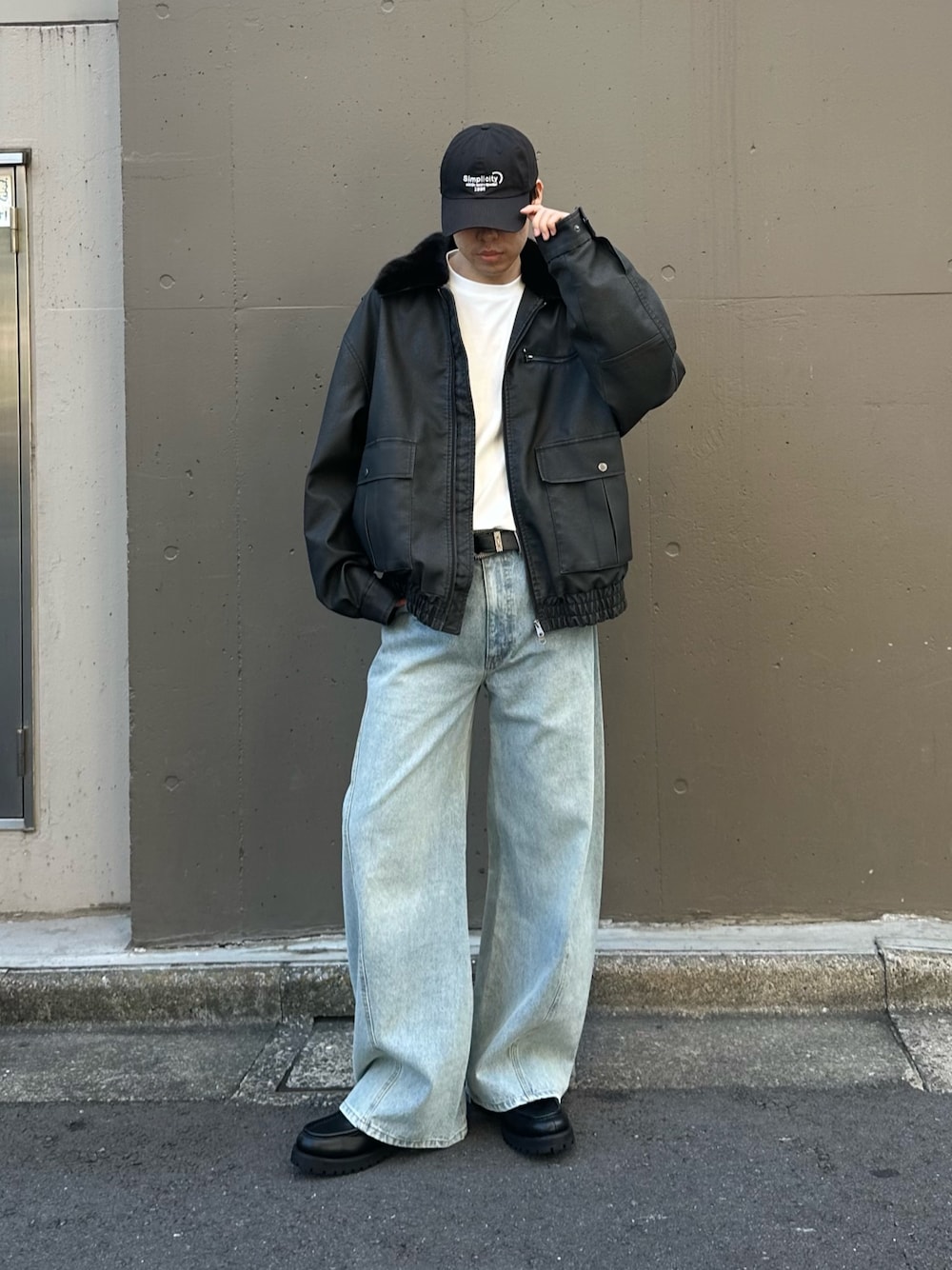 襟にファーの付いた黒レザージャケットを羽織って、ハンサムな印象に。足元にも革靴を選ぶことで、白Tとデニムというカジュアルな組み合わせを大人っぽくまとめています。