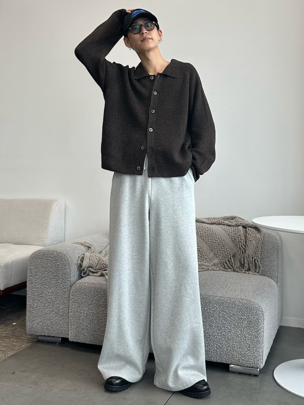 ダークブラウンのニットポロカーディガンに、ライトグレーのワイドスウェットパンツを合わせたコーディネートです。