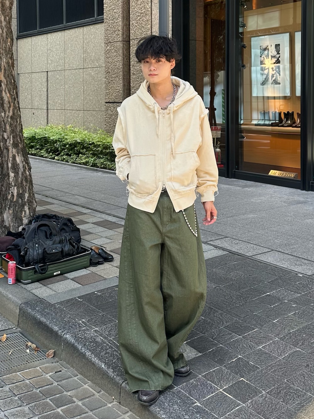 オフホワイトのパーカーに、カーキのデニムパンツを合わせた、カジュアルな着こなしです。革靴を合わせることで、きれいめな印象をプラスしています。ネックレスとウォレットチェーンがアクセントになっています。
