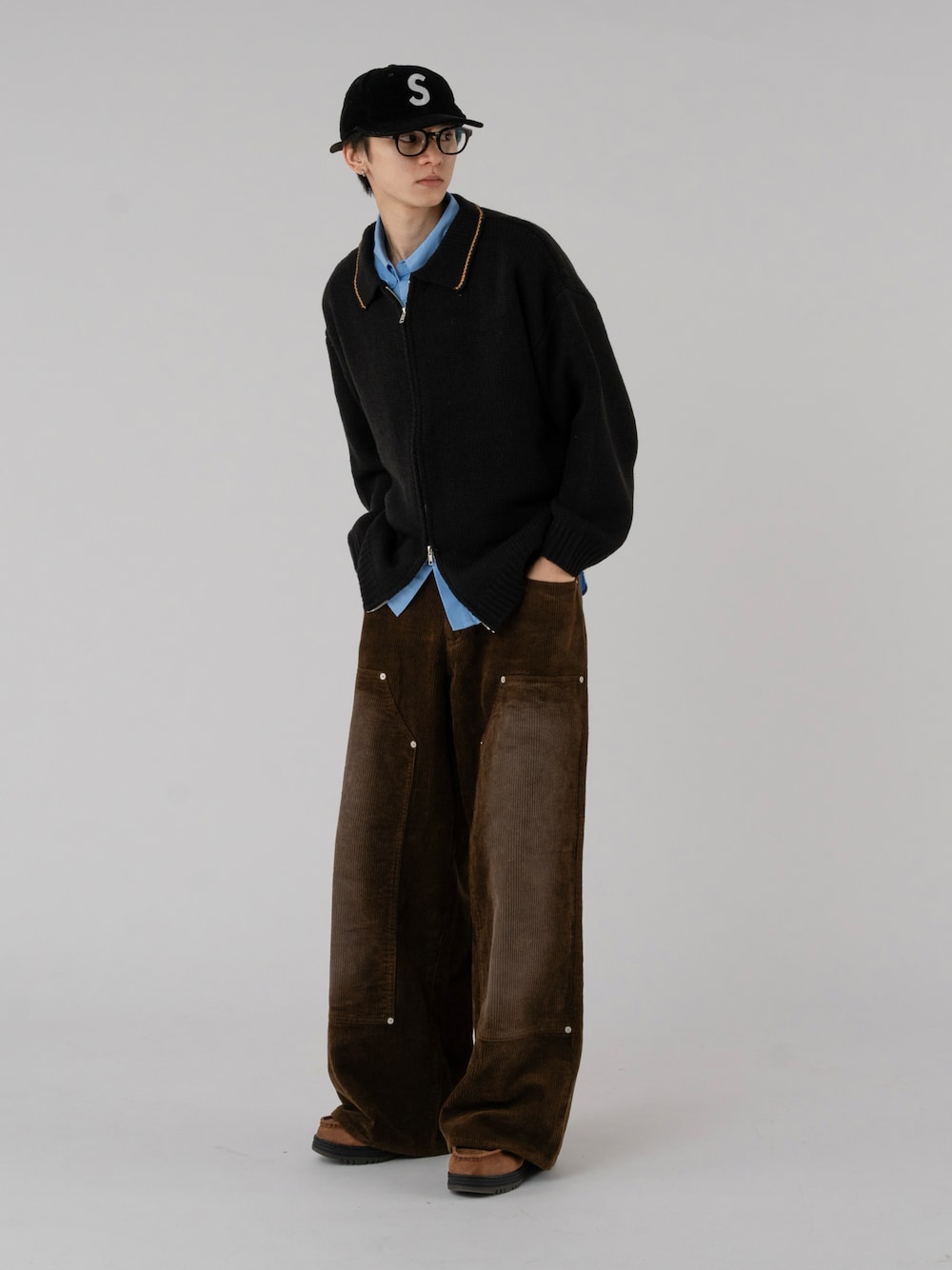 黒のジップニットにブルーのシャツを重ね、ブラウンのコーデュロイパンツを合わせたストリートミックスコーデ。 デザインが特徴的な極太のコーデュロイパンツが、着こなしに強い存在感とワークテイストを加えています。 トップスはジップニットでコンパクトにまとめ、鮮やかなブルーのシャツを差し色にすることでバランスを取っています。