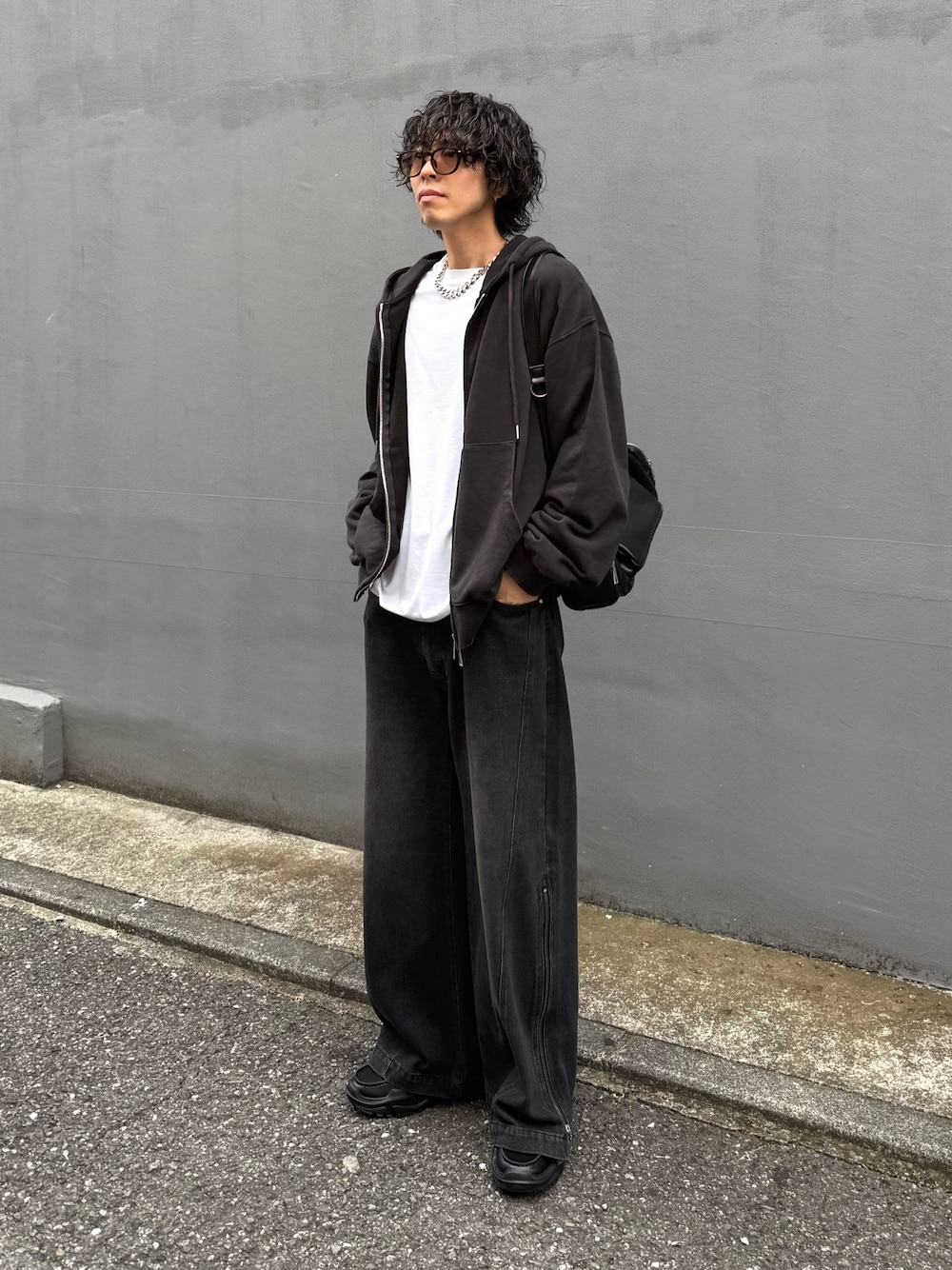 黒のオーバーサイズジップパーカーに白Tシャツを重ね、ワイドな黒デニムを合わせたコーデ。 インナーに白を効かせることで、ダークトーン中心の着こなしにメリハリと抜け感を加えています。 ゆったりとしたパーカーの袖やシルエットが、ボトムスのボリューム感と相まってリラックスした雰囲気を演出。