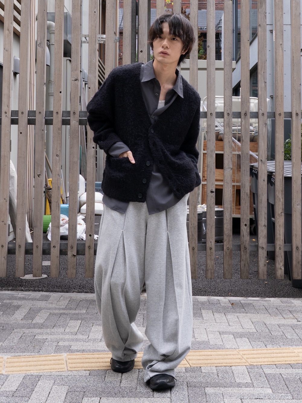 黒のシャギーニットカーディガンにグレーのシャツを重ね、グレーのスウェットパンツを合わせたコーデ。 インナーとして使用したグレーのシャツが、起毛感のあるカーディガンとスウェットライクなパンツを上手く繋いでいます。 全体をモノトーンで統一しつつ、タックの入った極太パンツで遊び心を加えた、リラックス感のある着こなし。