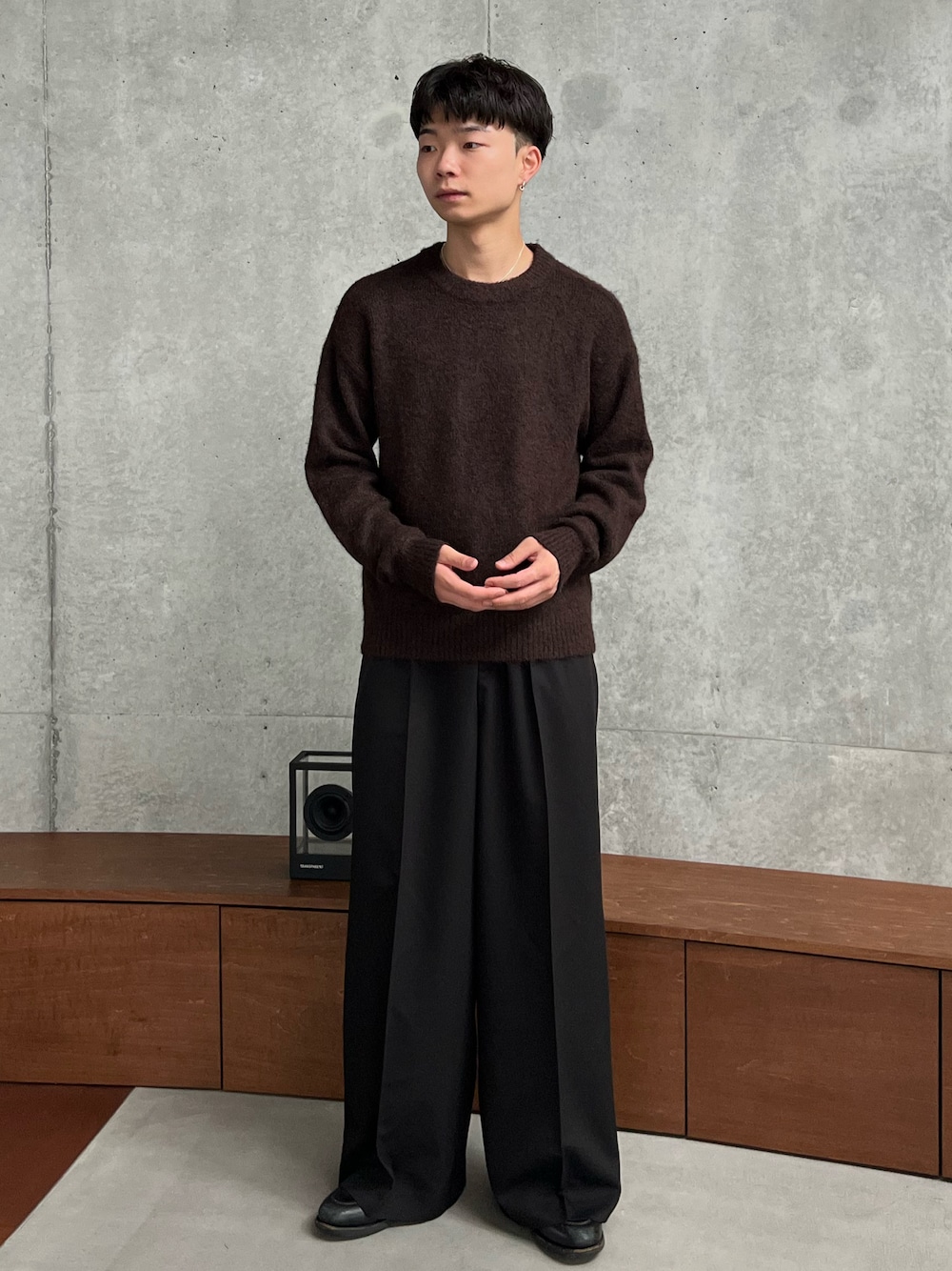ブラウンのハイゲージニットに、黒のワイドスラックスを合わせたシンプルなコーデ。 トップスはジャストサイズ気味のニットですっきりと見せつつ、ボトムスはボリュームのあるワイドスラックスでメリハリを。 上品なニットの素材感とスラックスの落ち感が、大人っぽく落ち着いた雰囲気を演出しています。