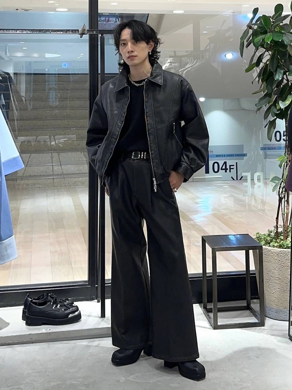 黒のレザージャケットに黒スウェットを合わせ、黒のレザーパンツを着用したワイルドなブラックコーデ。 上質なレザージャケットの艶感が、着こなし全体に洗練された大人っぽい雰囲気を加えています。 ボトムスは太めのレザーパンツを選び、重厚感とトレンド感を両立させた大人ストリートスタイルです。