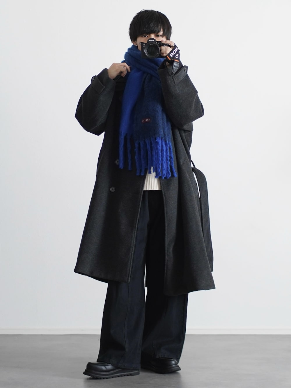 ダークグレーのウール混ロングコートに、白ニットとワイドパンツを合わせた冬コーデ。 ゆったりとしたオーバーサイズのコートが、リラックス感のあるAラインシルエットを構築しています。 鮮やかなブルーのマフラーをアクセントにすることで、重くなりがちなコートスタイルにアクセントをプラスしています。