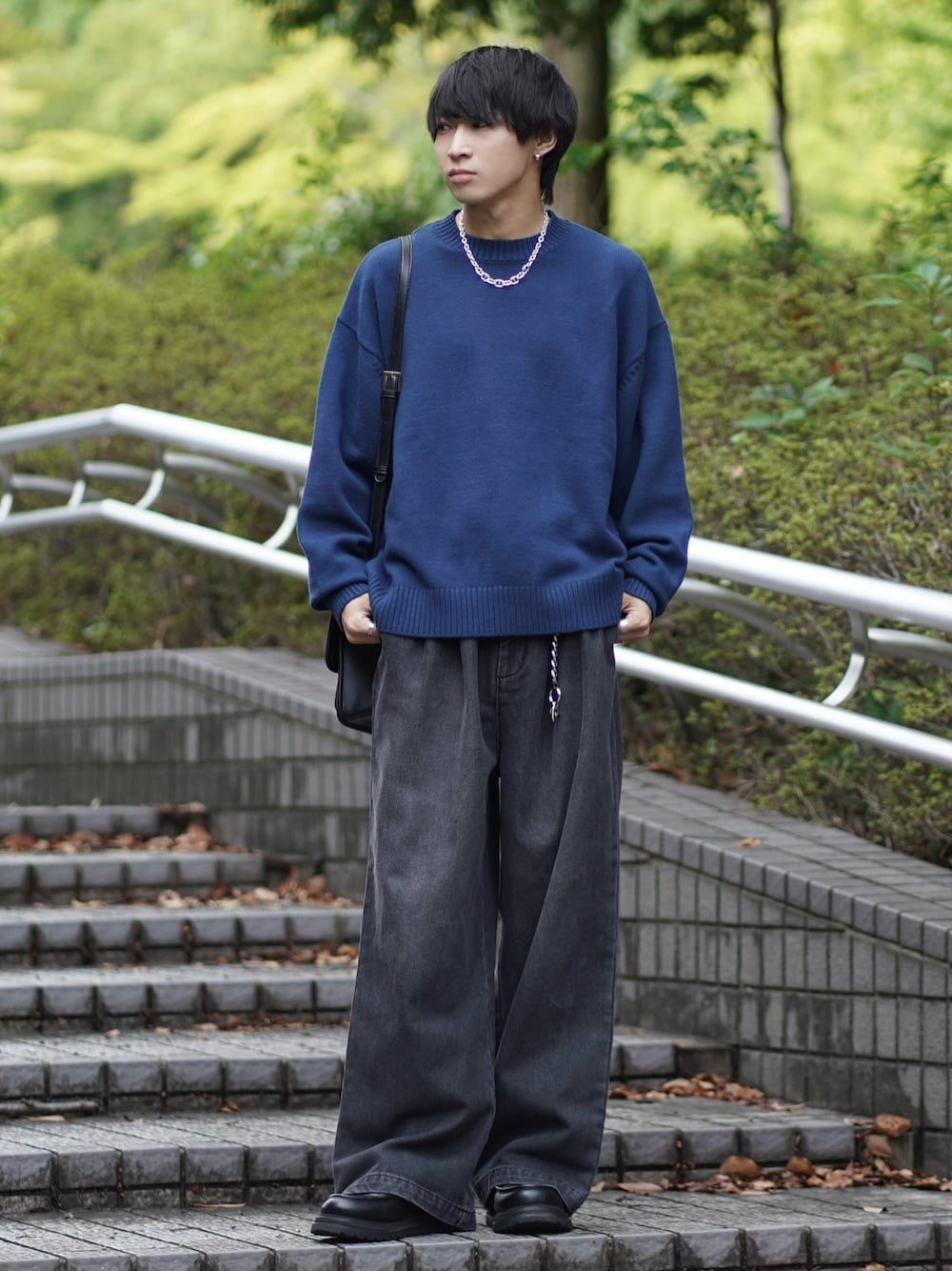 ブルーのクルーネックニットに、色落ち感のある黒のワイドデニムを合わせたコーデ。 ストンと落ちるワイドデニムのシルエットが、リラックス感のある今っぽいムードを演出。 鮮やかなブルーのニットを合わせることで、重くなりがちなデニムスタイルをクリーンにまとめています。