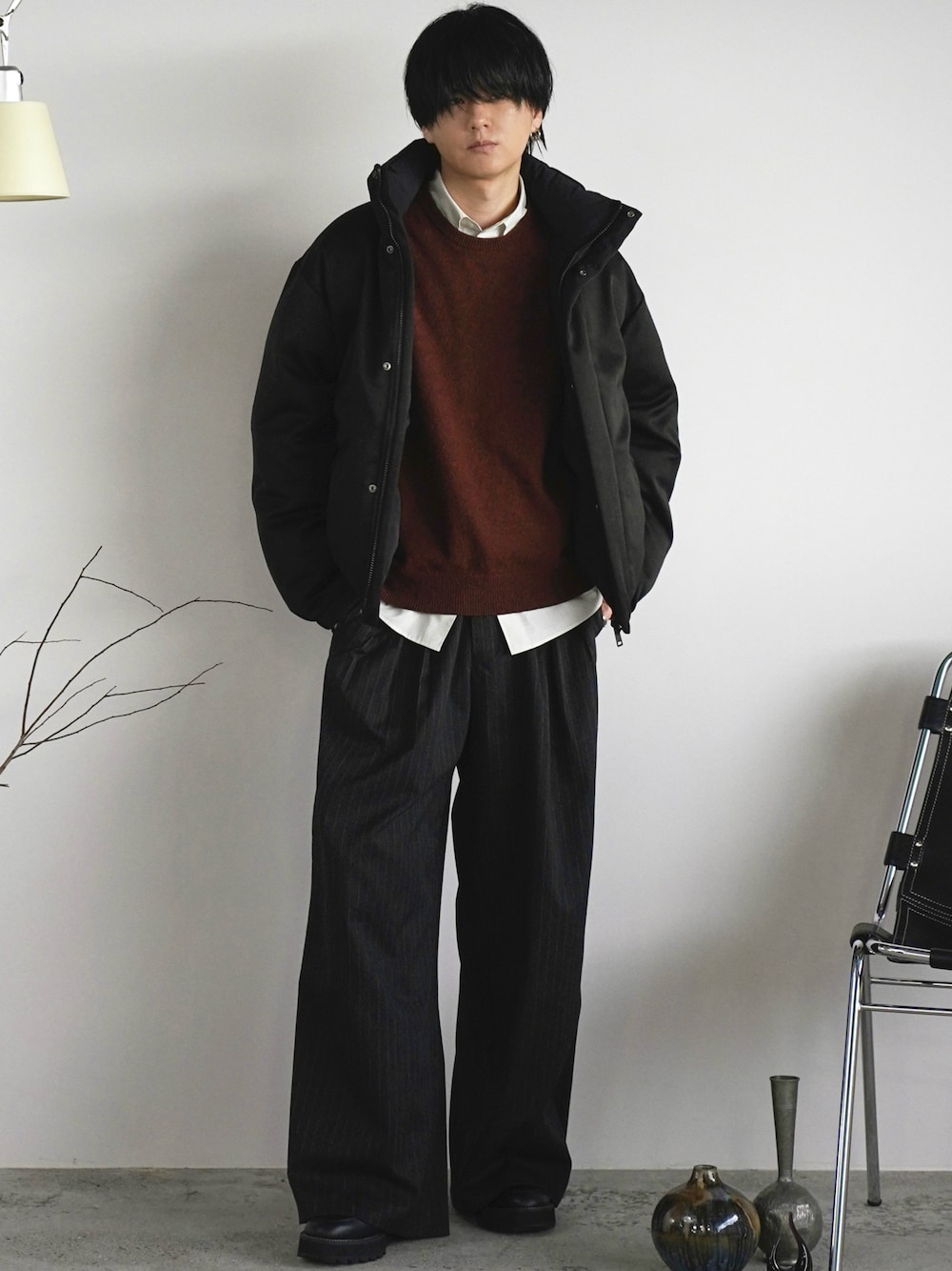 上半身にボリュームを持たせつつ、スラックスと革靴で引き締め、全体を大人っぽい雰囲でまとめています。