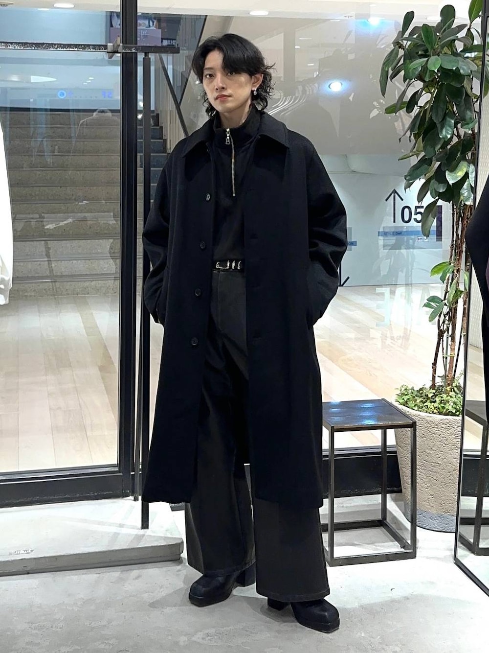 黒のロングコートにジップアップニットとワイドパンツを合わせた、オールブラックコーデ。 ミニマルなデザインのロングコートが、洗練された大人っぽい雰囲気を演出しています。 インナーとボトムスも黒で統一し、素材感の異なるアイテムを組み合わせることで、奥行きのある着こなしに。