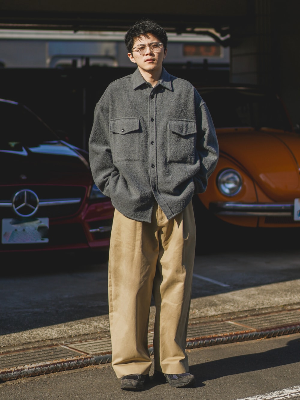 グレーのオーバーサイズシャツジャケットに、ベージュのワイドチノパンを合わせたリラックスコーデ。 ストンとした落ち感のあるワイドなチノパンが、力の抜けた大人のカジュアルスタイルを演出。 トップスもゆったりとしたシルエットで合わせることで、全体のボリュームに統一感を持たせています。