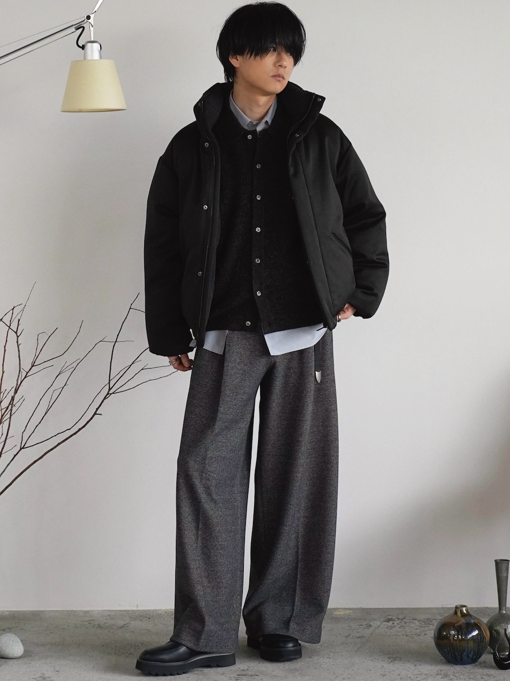 黒のダウンジャケットに、黒のカーディガンとライトブルーのシャツを重ね、グレーのワイドパンツを合わせたコーデ。 ボリューム感のあるダウンジャケットを羽織ることで、レイヤードスタイルにまとまりと防寒性をプラスしています。 全体をモノトーンで統一しつつ、ボトムスに落ち感のあるワイドパンツを合わせることで、リラックス感のある大人な雰囲気を演出。