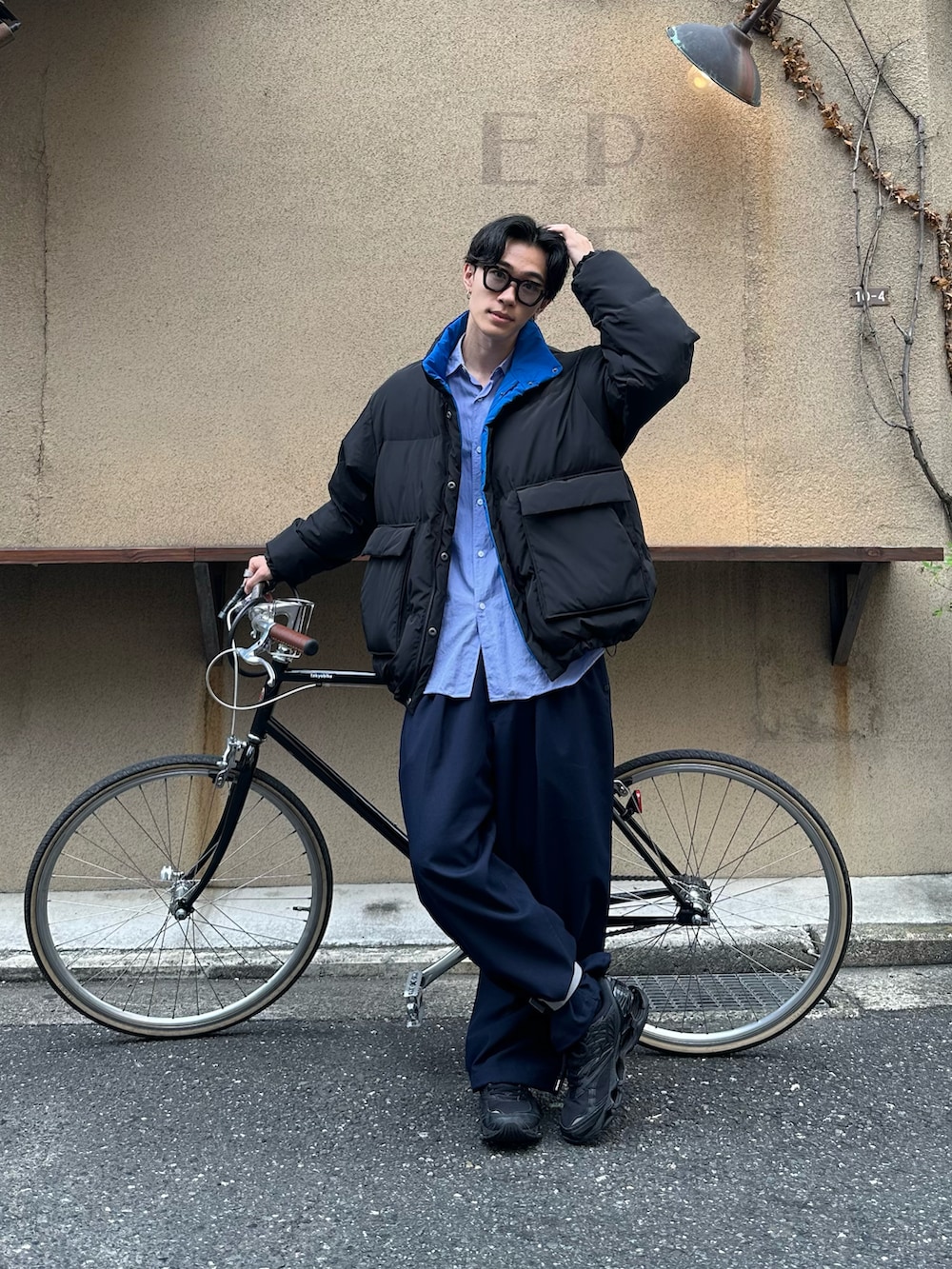 黒のダウンジャケットにライトブルーのシャツを重ね、ネイビーのワイドパンツを合わせたコーデ。 インナーにクリーンなライトブルーのシャツを合わせることで、重くなりがちな冬の装いに軽やかさと清潔感をプラス。 ジャケットの裏地とシャツの色味をさりげなくリンクさせ、統一感のあるスタイルを構築しています。