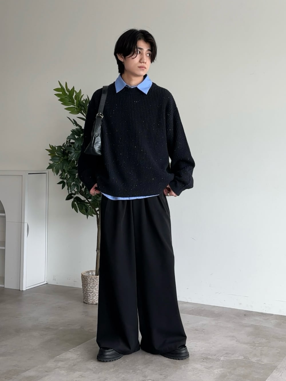 黒ニットとスラックスを合わせたコーデです。ブルーシャツをレイヤードすることで、清潔感と華やかさがプラスされています。ニットの裾からシャツが覗いていることで、メリハリも生まれています。