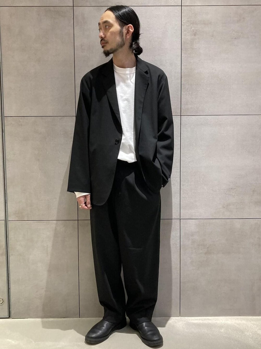 黒ジャケットとスラックスのセットアップに白Tシャツを合わせた、大人のデートコーデ。 シンプルなモノトーンスタイルながらも、ジャケットとパンツの程よいリラックス感が魅力的。 足元は革靴で品良くまとめ、洗練された大人の雰囲気を演出しています。