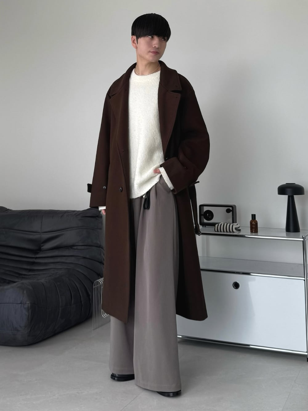 ブラウンのロングコートに白のニット、グレーのワイドスラックスを合わせた冬のデートコーデ。 コートのクラシックな雰囲気と、柔らかなニットの組み合わせが、上品で親しみやすい印象を与えています。 アースカラーを使うことで、温かみと洗練された大人っぽさを演出しています。