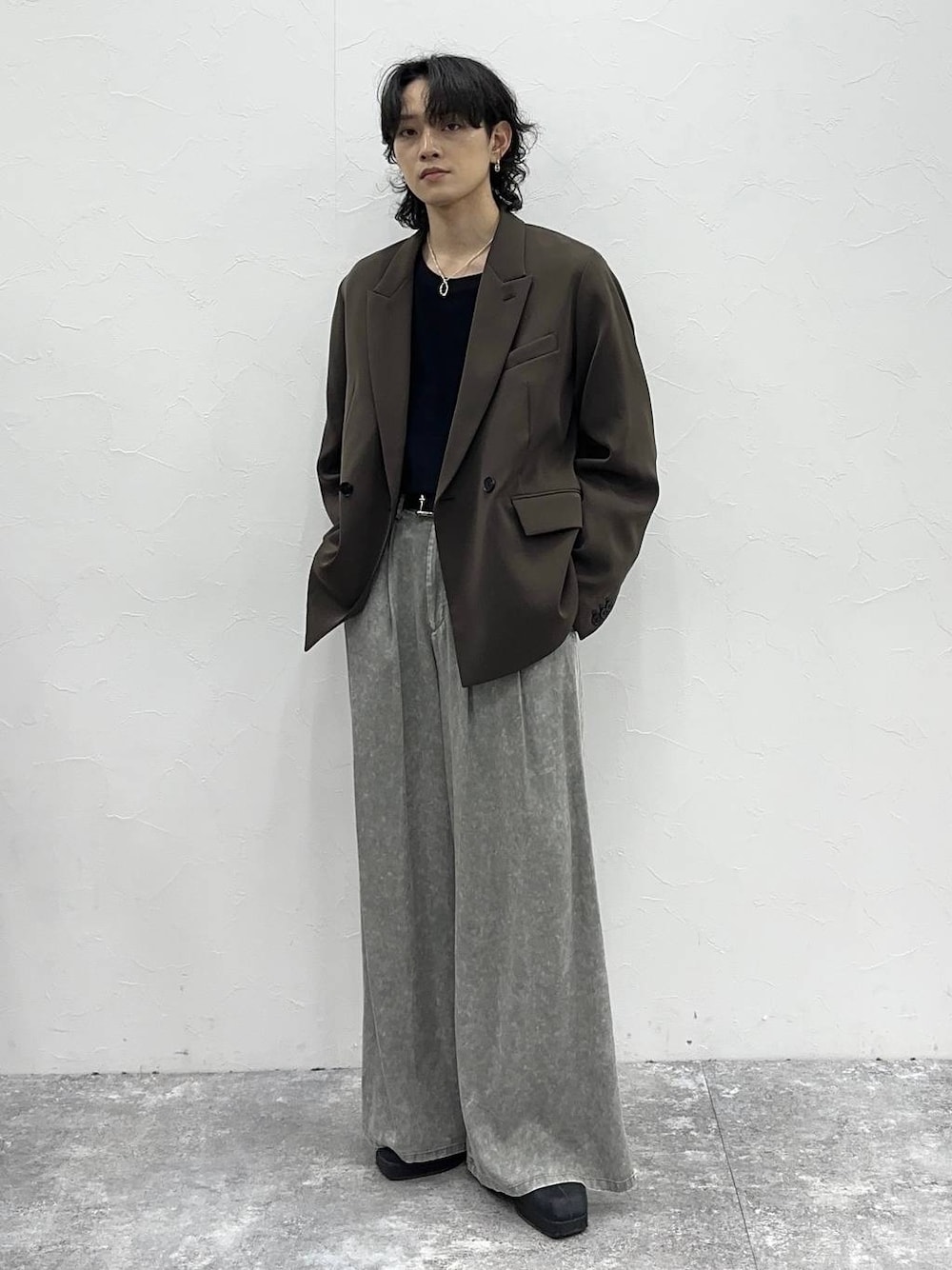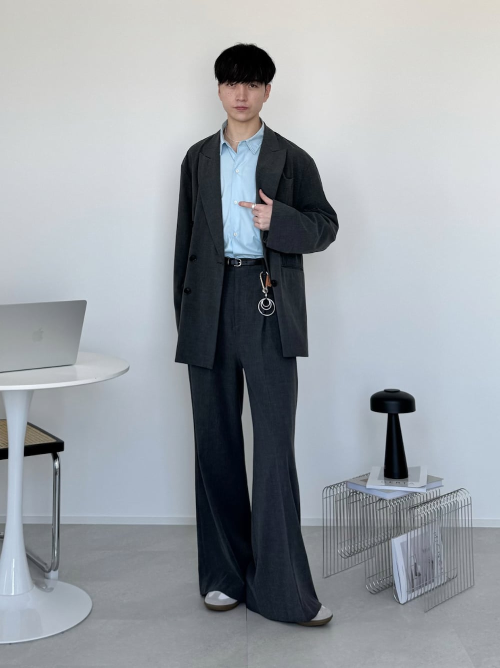 チャコールグレーのダブルジャケットにライトブルーのシャツ、同色のフレアスラックスを合わせたきれいめデートコーデ。 ジャケットとスラックスのセットアップスタイルが、スマートで都会的な印象を演出。 足元は黒スニーカーで軽やかさを加え、ほんの少し抜け感をプラスしています。