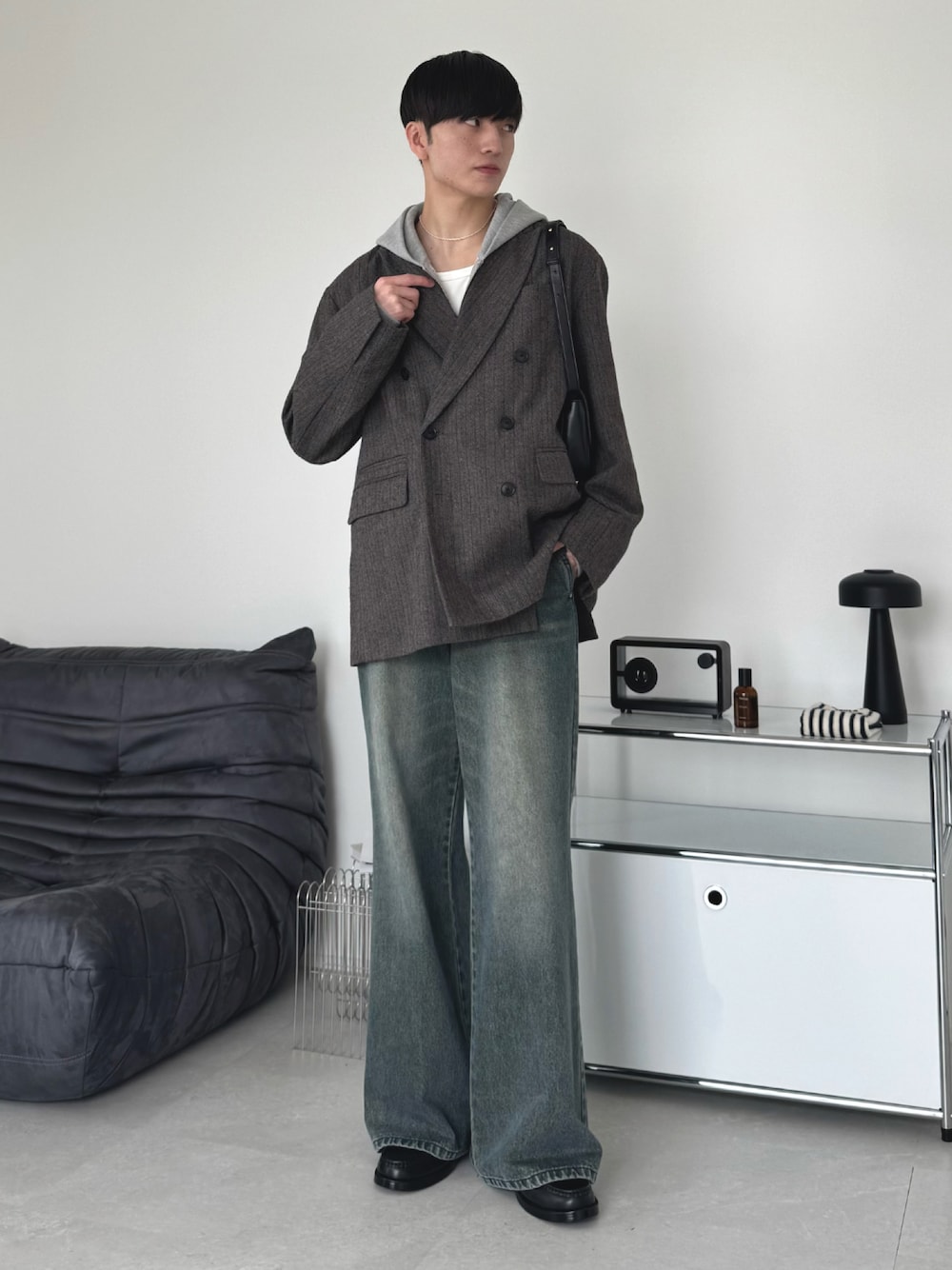 パーカー×デニムパンツというカジュアルな組み合わせに、テーラードジャケットを羽織ってきれいめ感を出したコーデです。足元に革靴を取り入れることで、よりきれいめな印象を高めています。