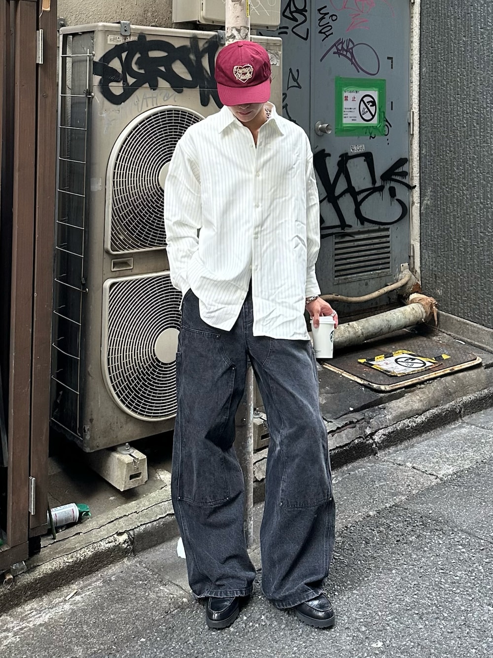 白のストライプシャツに、黒のワイドデニムパンツを合わせたストリートコーデ。 クリーンな印象のストライプシャツをあえてルーズに着こなすことで、リラックス感を演出しています。レッド系のキャップをアクセントに。