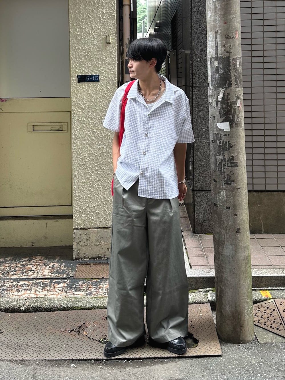 チェック柄の開襟シャツにカーキのワイドパンツ、足元は革靴を合わせた夏のデートコーデ。 シャツの軽やかな素材感とワイドパンツの組み合わせが、リラックス感と抜け感を演出しています。 差し色の赤のショルダーバッグが、コーディネートに遊び心をプラス。