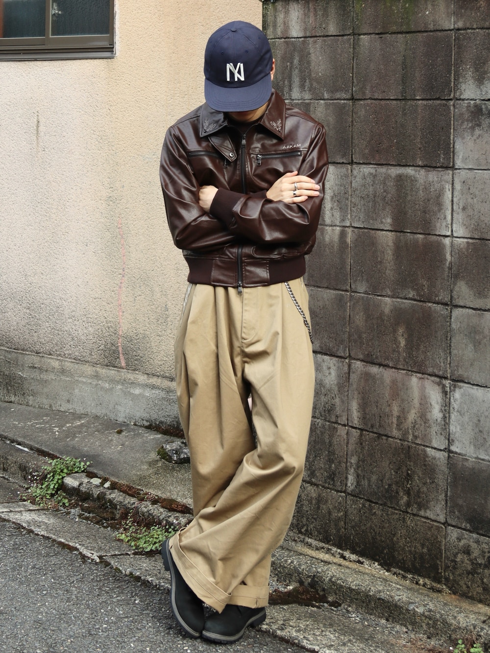 ブラウンのレザージャケットに、ベージュのチノパンを合わせたコーデ。ジャケットに短い丈を、チノパンにワイドシルエットを選ぶことで、スタイルアップして見せています。ネイビーのキャップをアクセントに。