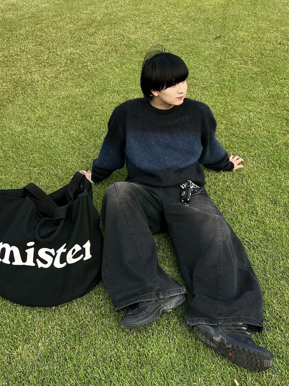 黒のグラデーションニットとワイドデニムパンツを合わせたカジュアルデートコーデ。 少しルーズなシルエットながらも洗練されたデザインのシルエットが、リラックス感とこなれた印象を両立しています。 足元はボリュームのあるスニーカーでトレンド感を加えています。