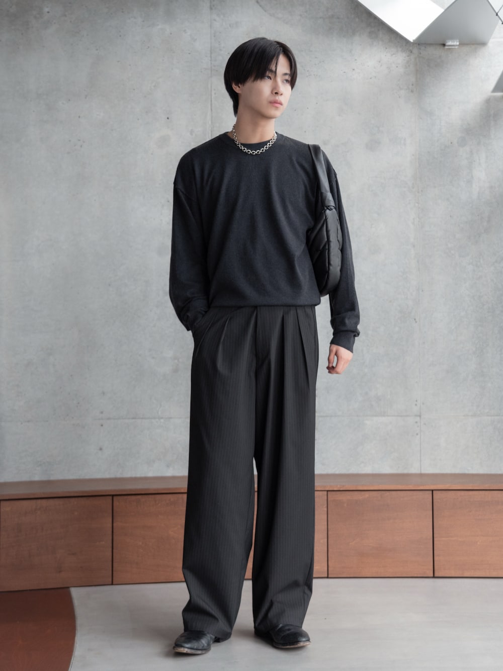 黒のハイゲージニットに、スラックスを合わせたシンプルコーデです。すっきりとしたシルエットにまとめることで、洗練感のあるスタイルに。シルバーのネックレスでメリハリのある印象をプラスしています。