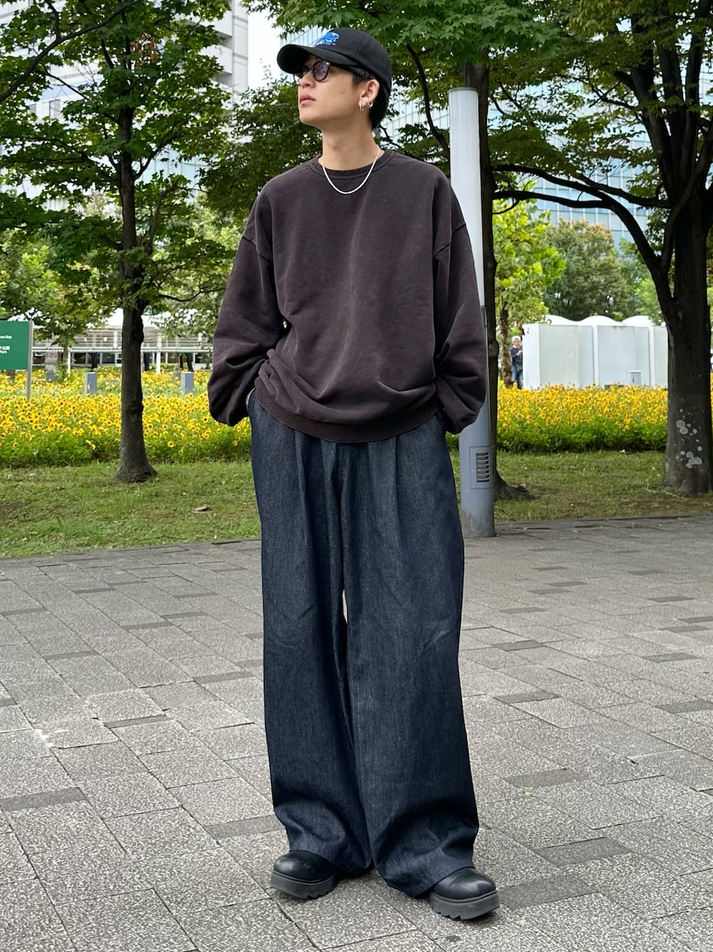 ダークブラウンのオーバーサイズスウェットに、ネイビーのワイドデニムパンツを合わせた大人カジュアルコーデ。 落ち着いた色味とゆったりとしたシルエットが、リラックス感とこなれた大人の雰囲気を演出しています。 足元はボリュームのあるシューズでバランスをとり、キャップを合わせることでストリート感をプラスしています。