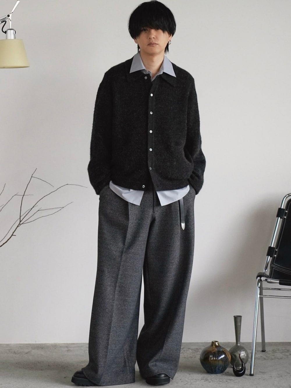 ダークグレーのカーディガンにライトブルーのシャツをレイヤードし、グレーのワイドスラックスを合わせたコーデ。 シャツとスラックスのきれいめな組み合わせに、起毛感のあるカーディガンで柔らかさをプラスし、デートにぴったりの親しみやすい雰囲気に。 全体をモノトーンとブルー系でまとめることで、大人っぽく洗練された印象を与えています。