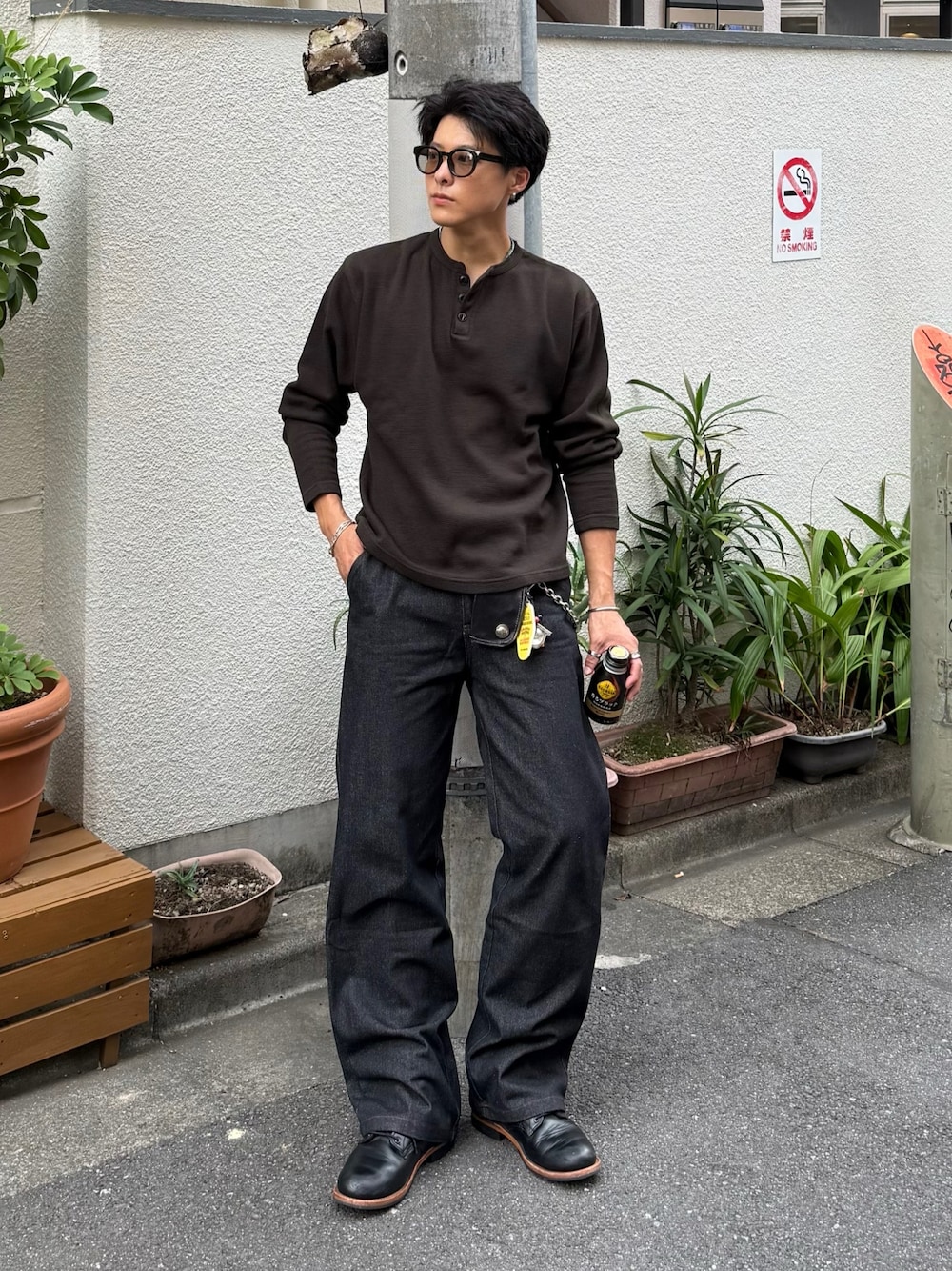 ダークブラウンのヘンリーネックシャツに、インディゴデニムのワイドパンツを合わせたコーデ。 濃いインディゴの色合いとセンタープレスが、カジュアルなデニムを上品に見せています。 トップスや革靴をダークトーンで統一することで、洗練された大人っぽい雰囲気に仕上げています。