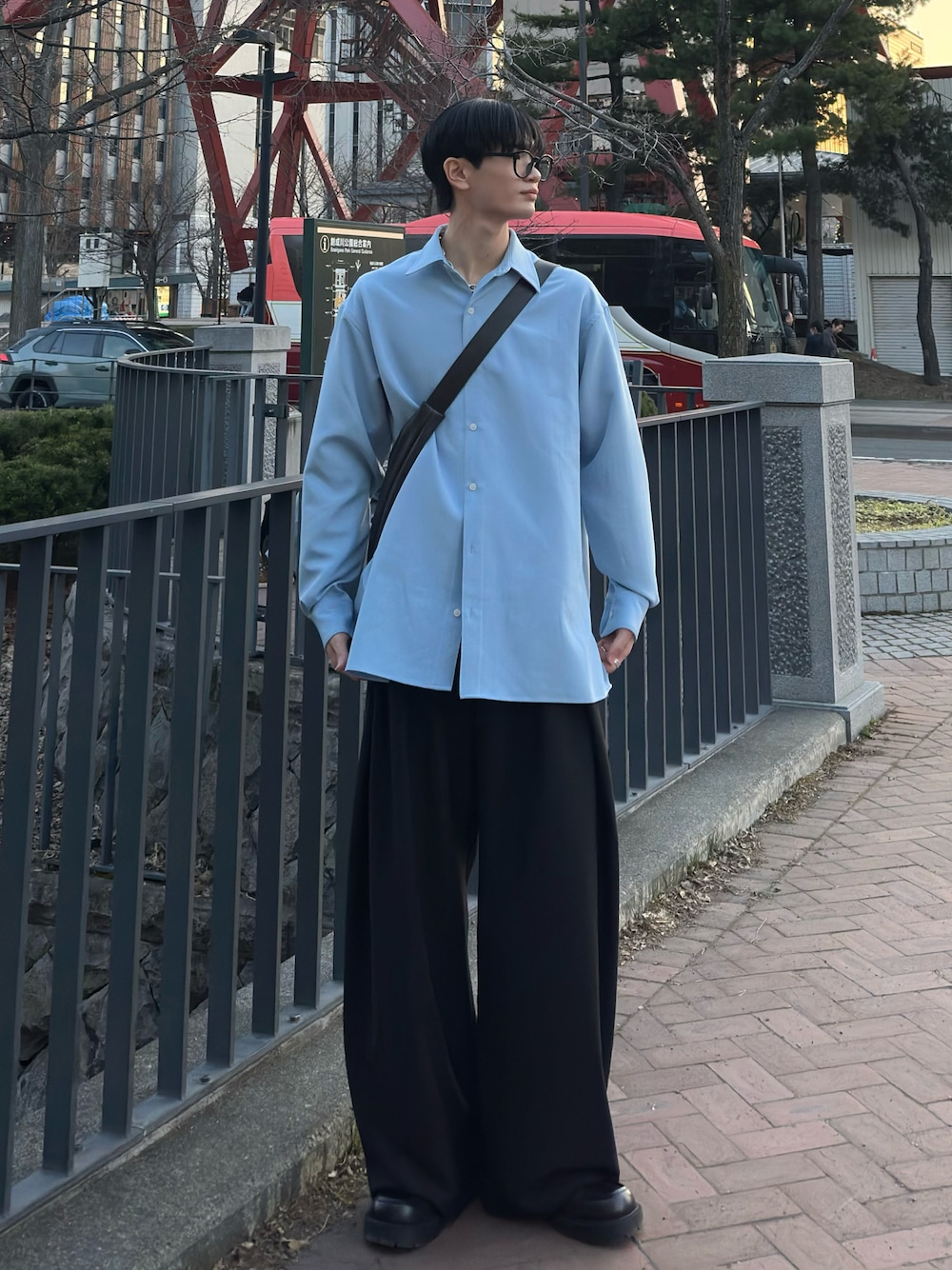 ライトブルーのオーバーサイズシャツに、黒のワイドパンツを合わせた春のデートコーデ。 シャツの柔らかな色合いとゆったりとしたシルエットが、リラックス感と爽やかさを両立。 黒のワイドパンツと厚底シューズで全体を引き締め、モードな抜け感を演出しています。